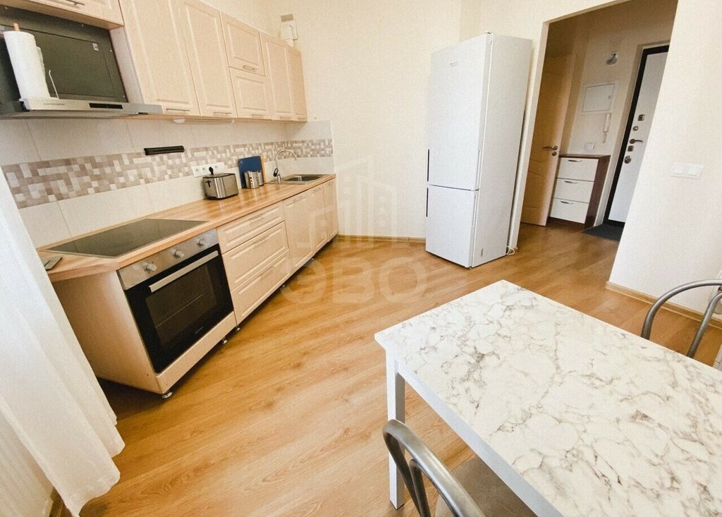 Кухня укомплектована необходимой техникой. Ванная комната в светлых тонах.