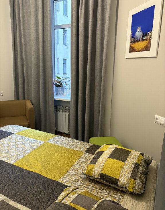 Окна выходят в тихий двор. В квартире изолированная спальня, кухня-гостиная с обеденным столом, мягкими стульями, двуспальным диваном, большим телевизором. Квартира оснащена холодильником, стиральной машиной, посудомоечной машиной, газовой плитой, электрочайником, СВЧ-печью, посудой и всем необходимым для комфортного проживания.