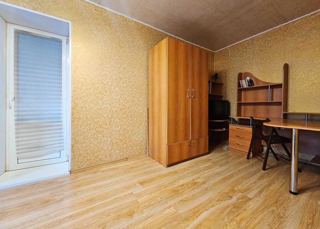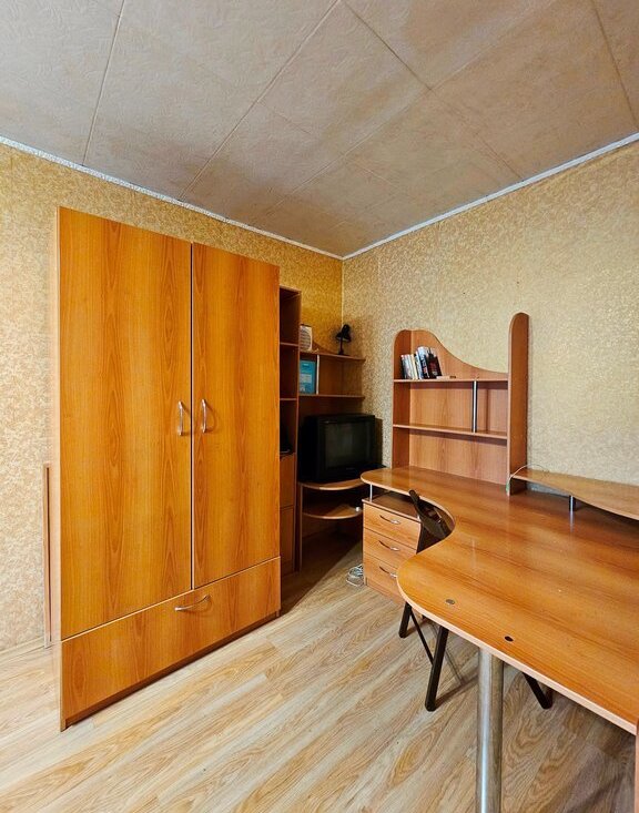 В комнате установлен вместительный шкаф, письменный стол. Имеется раскладная тахта. Из комнаты выход на застекленную лоджию.