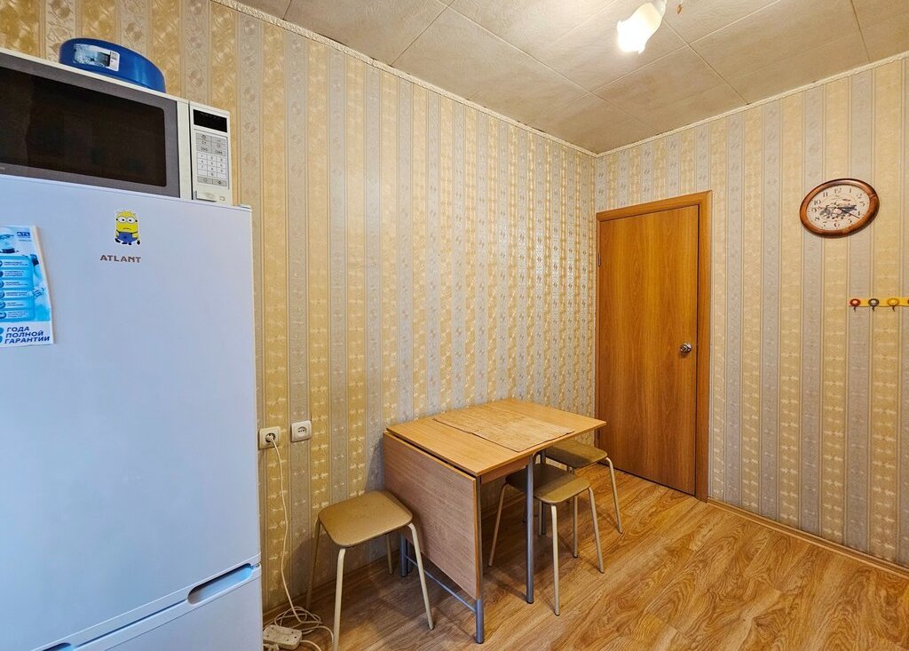 На кухне установлен кухонный гарнитур, холодильник, микроволновая печь, стол, стулья.