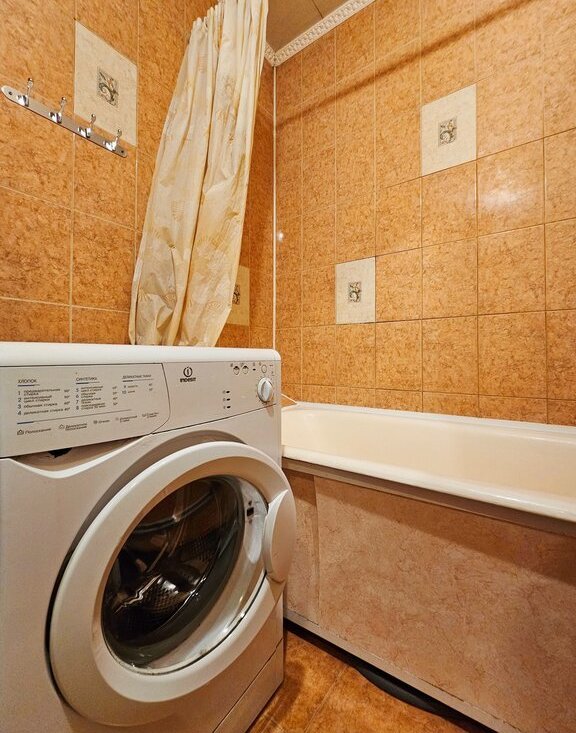 Санузел раздельный, в кафеле. Ванна, стиральная машина.