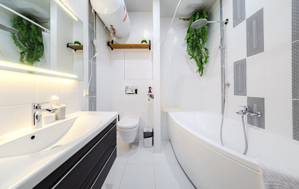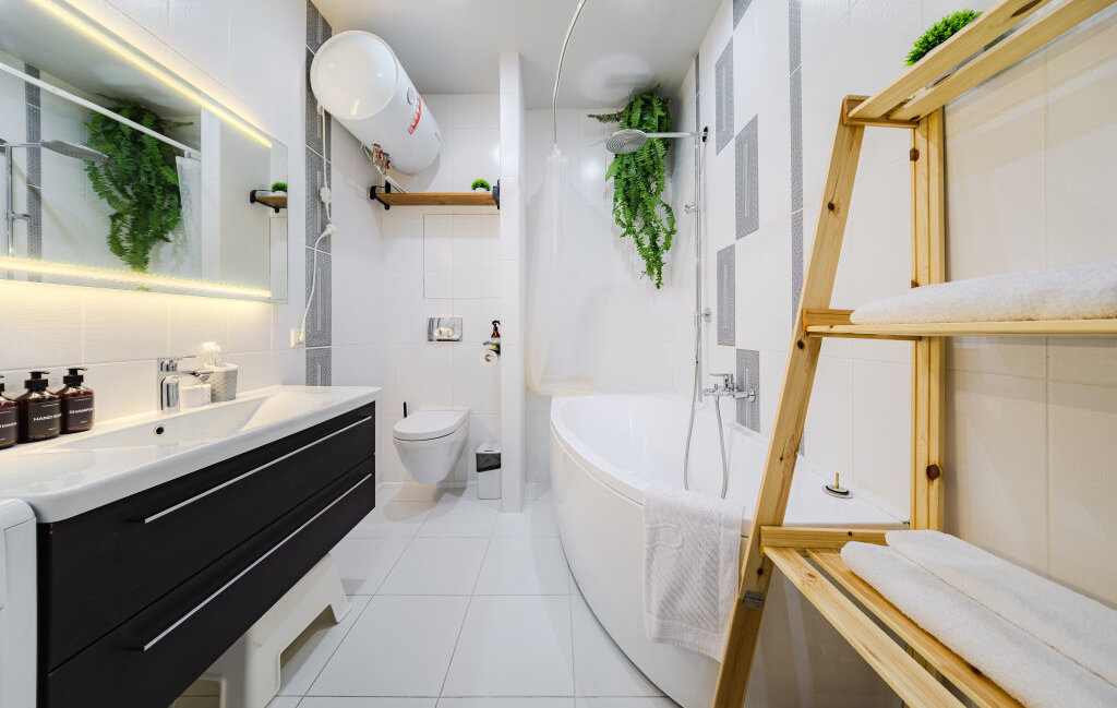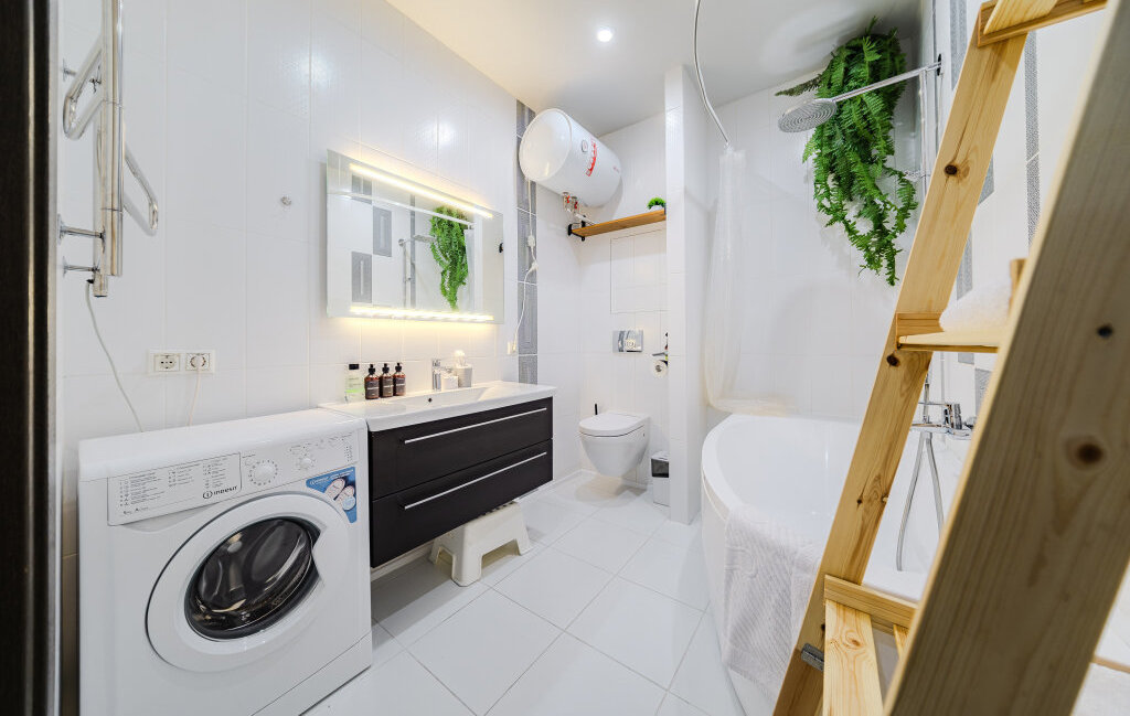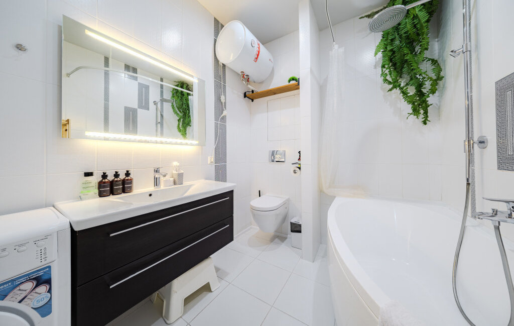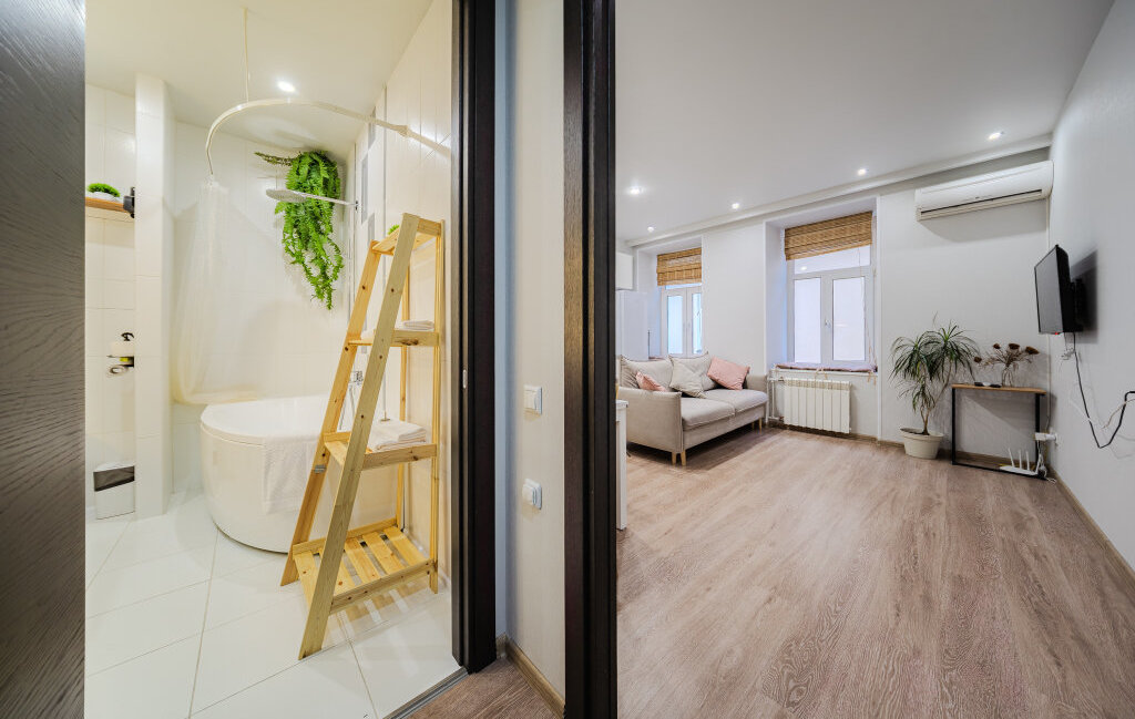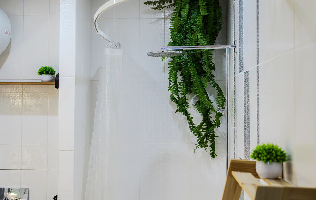 Ванная комната полноценная — с большой ванной и тропическим душем, что создаёт ощущение домашнего спа-пространства.