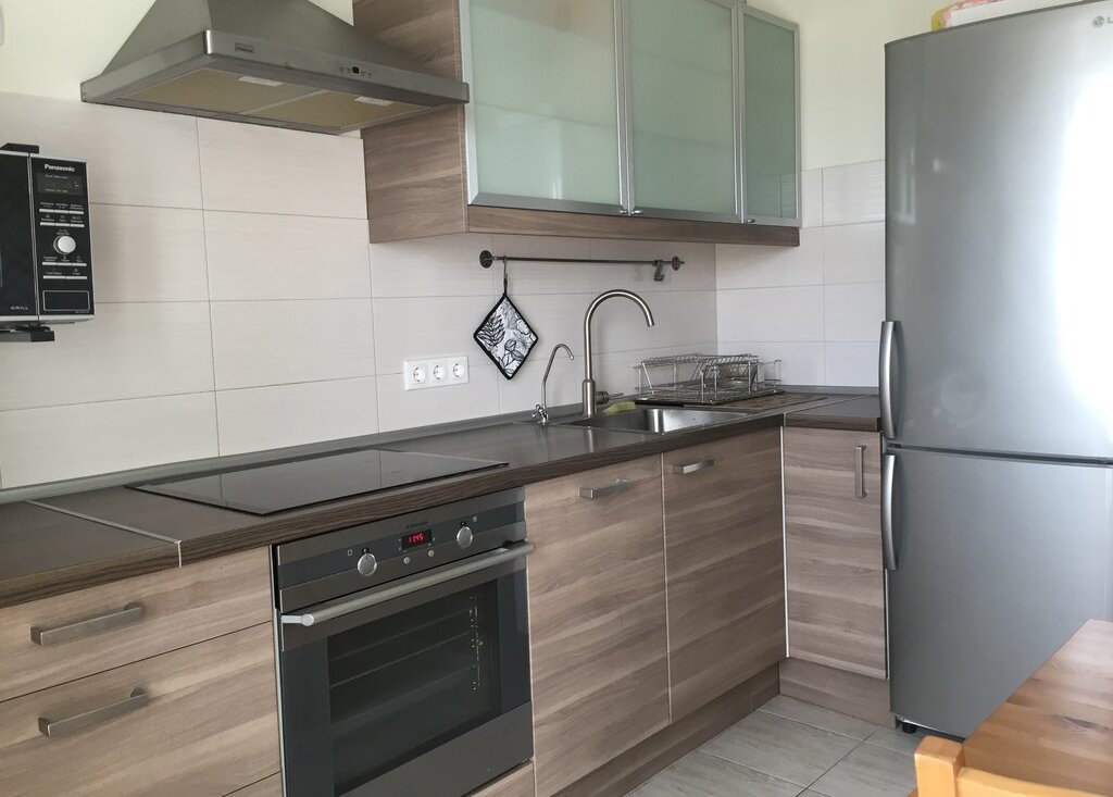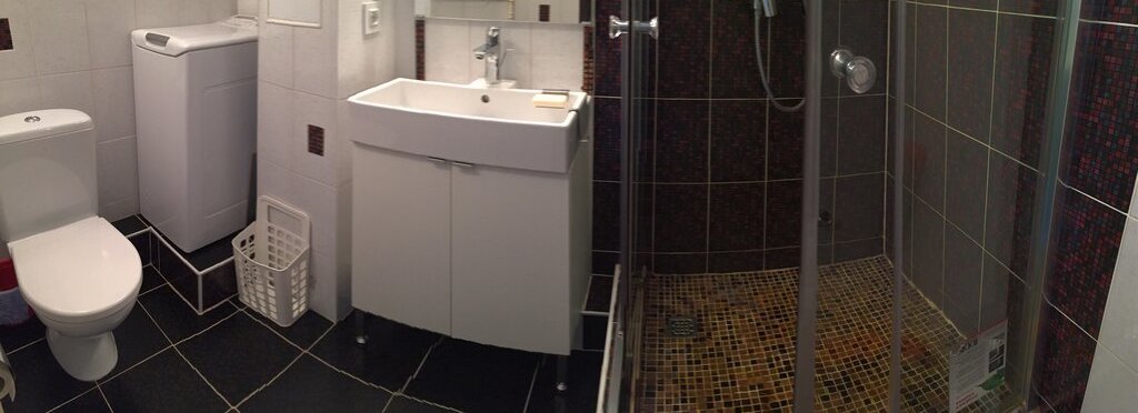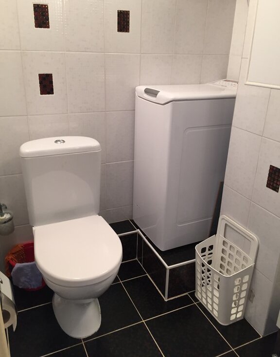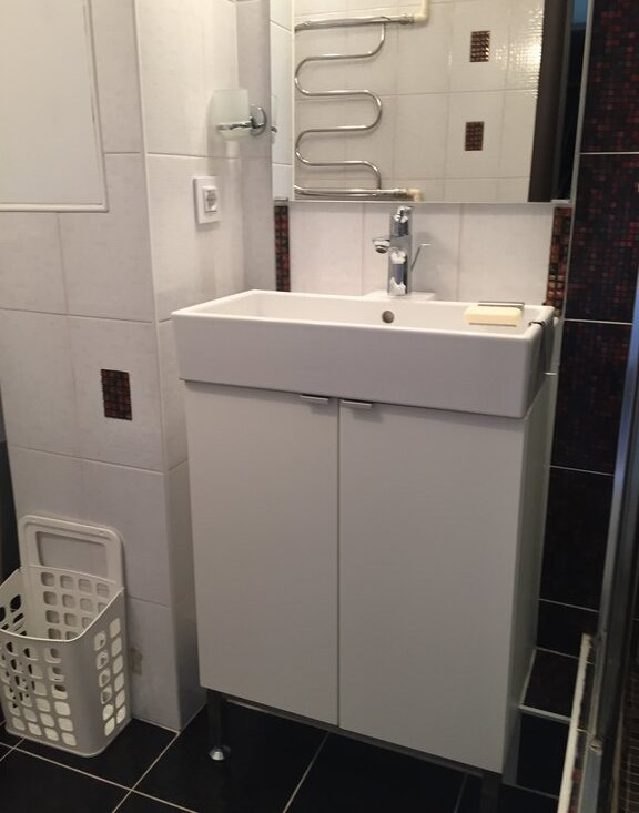 Санузел большой, смежный с душевой кабиной; холодильник новый, посудомоечная машина, стиральная машина, микроволновая печь, тёплый пол в ванной и на кухне, мебель мягкая и кухонная как новая (ИКЕА), без запахов, ремонт современный, кровать двуспальная (160 см), также есть раскладной диван, просторная отдельная гардеробная, отдельный коридор перед квартирой для велосипедов, обуви и пр.