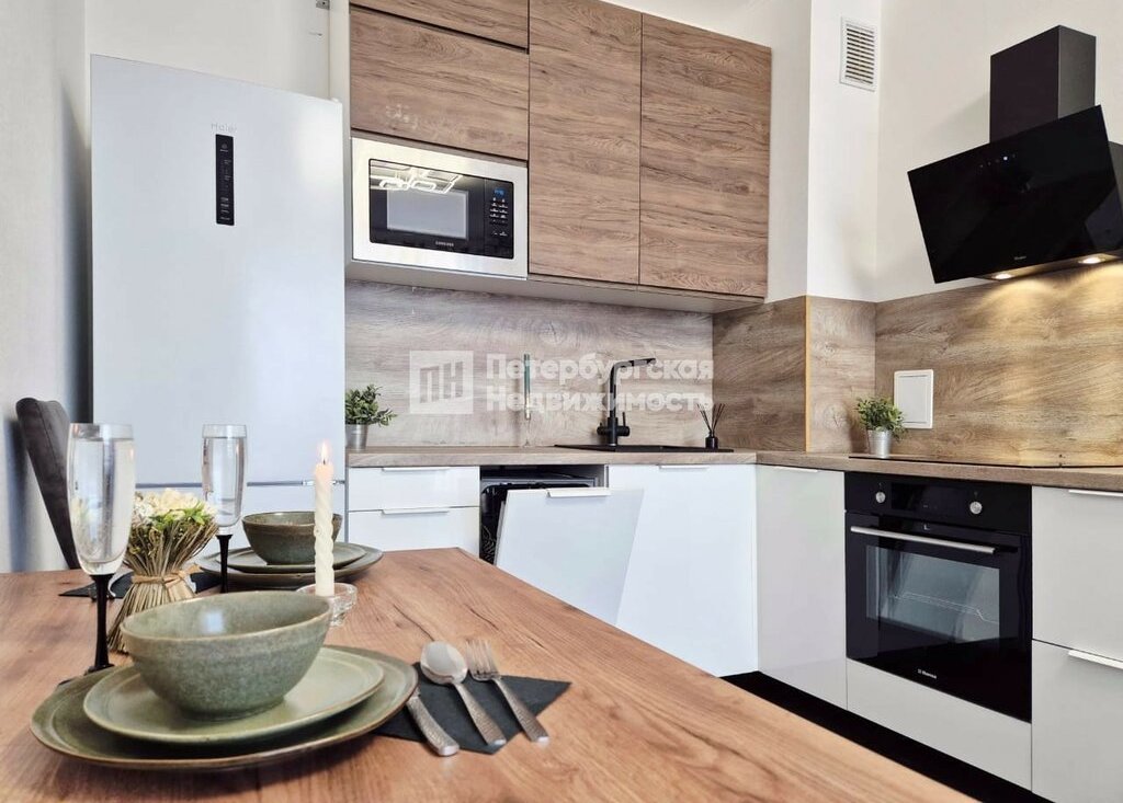 - Техника: посудомоечная машина, вытяжка, варочная поверхность, духовка, микроволновая печь, стиральная машина, чайник, холодильник, телевизоры и утюг .