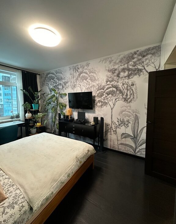 - В спальне сделан ремонт - высококачественный ламинат, интерьерные обои на заказ.