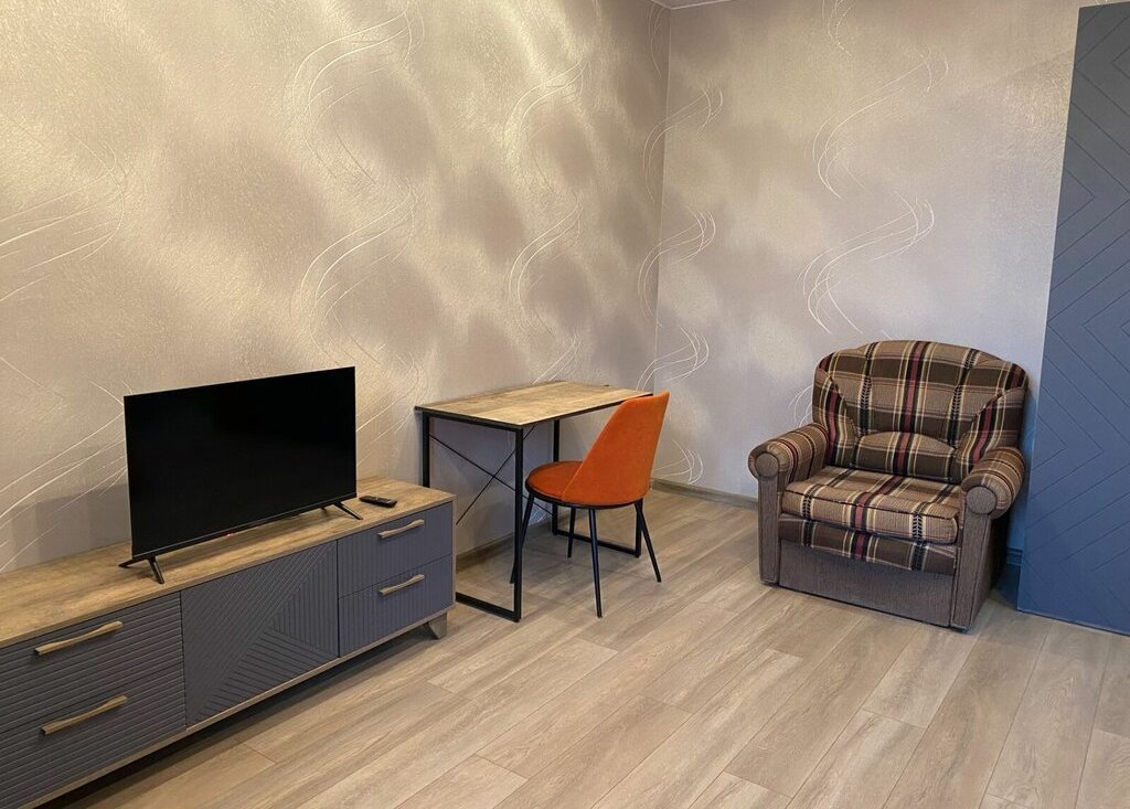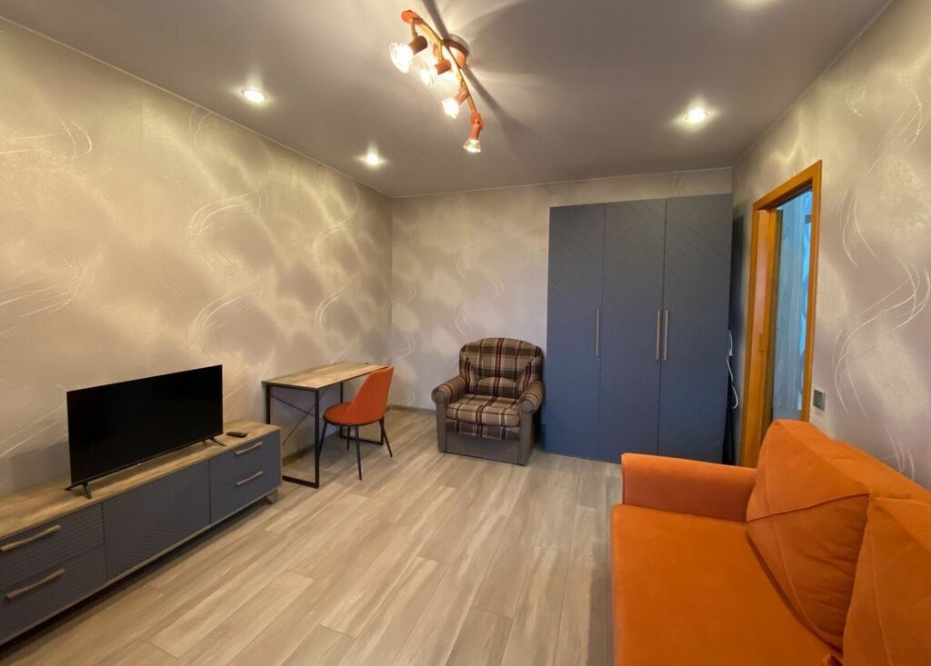 Просторная комната со спальным местом. Выход на застекленную лоджию из комнаты. Современный ремонт, мебель и освещение.