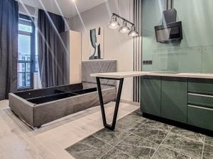 Техника и мебель в квартире новые. Качественные и лаконичные диваны от «MZ5 Group» раскладываются. В прихожей: зеркало в полный рост, пуф, настенная вешалка, полки.