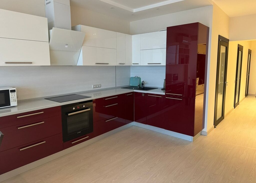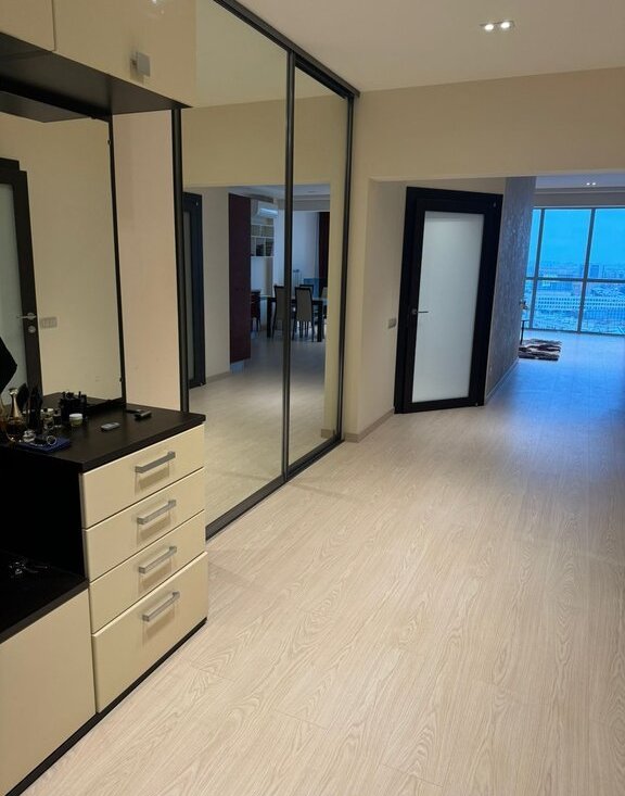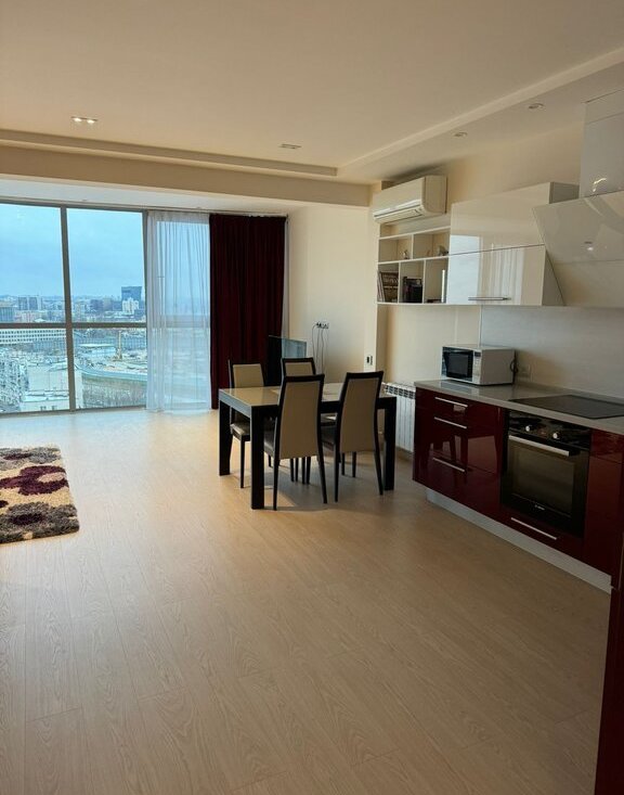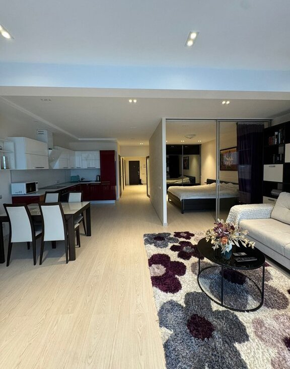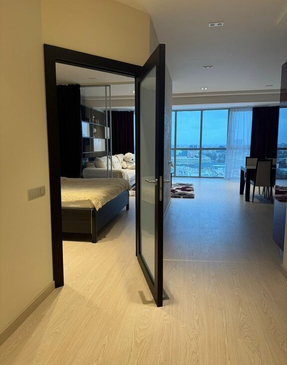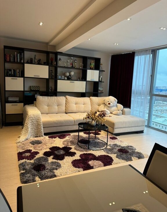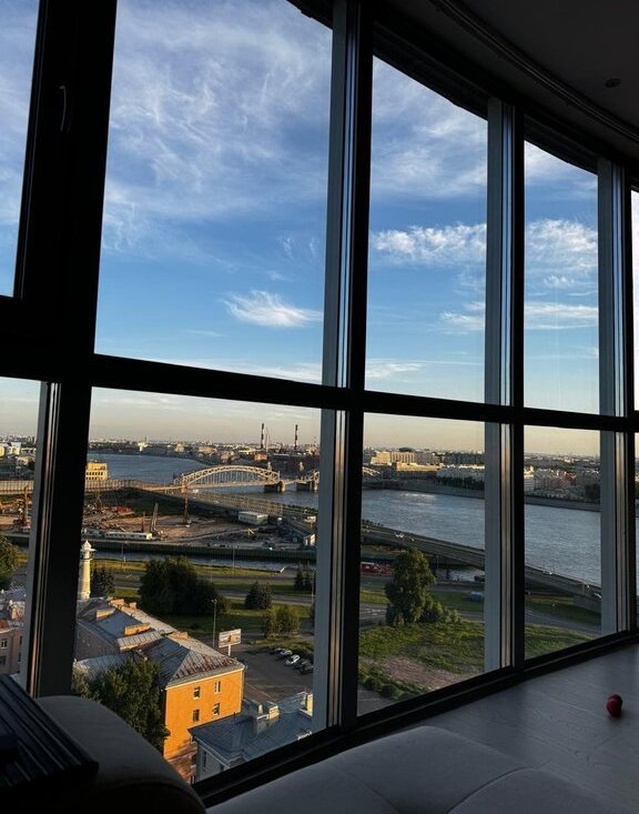 Квартира с панорамным видом: вся стена выполнена из стеклянных окон, наполняющих пространство светом и открывающих захватывающий вид на Неву и Большеохтинский мост. Сдается до сентября 2026 года, с возможным продлением. Площадь квартиры составляет 80 квадратных метров на 17 этаже. Квартира со свободной планировкой: пространство организовано в формате open space, при этом спальня отделена стеклянными раздвижными дверями с видом на город.