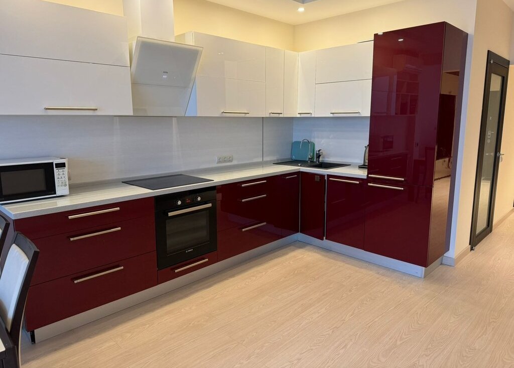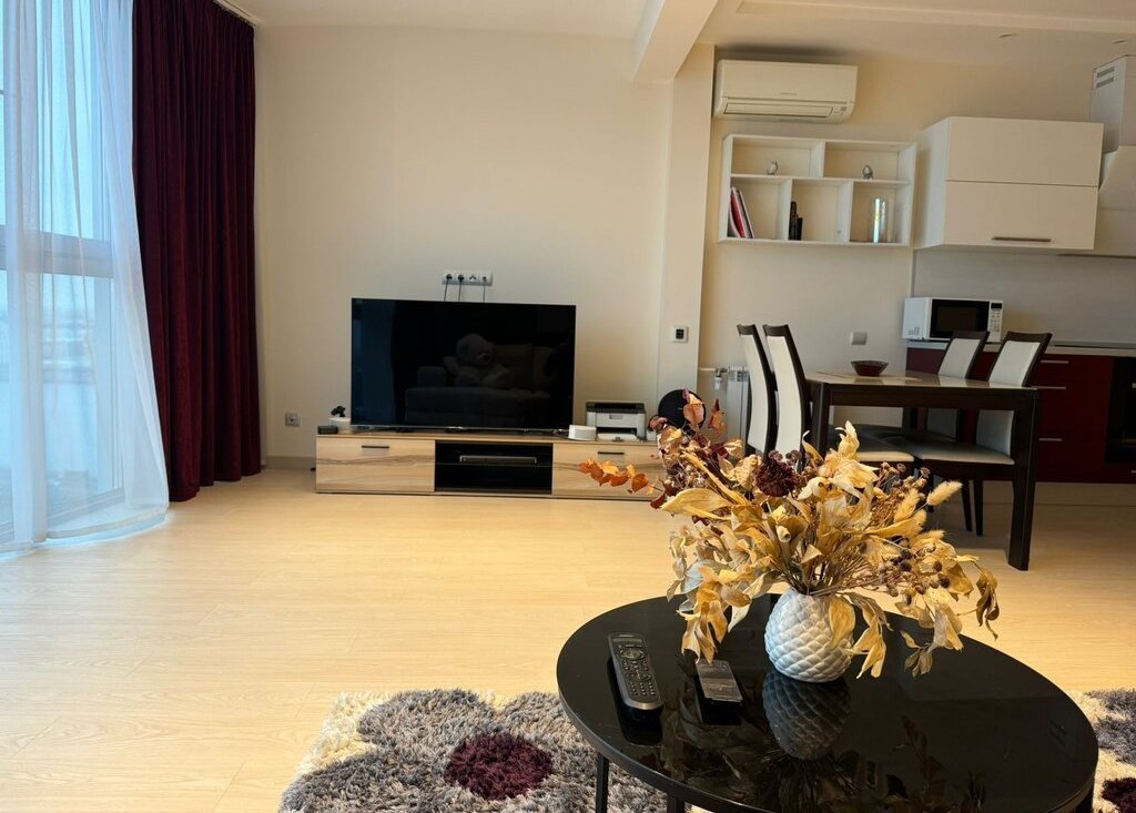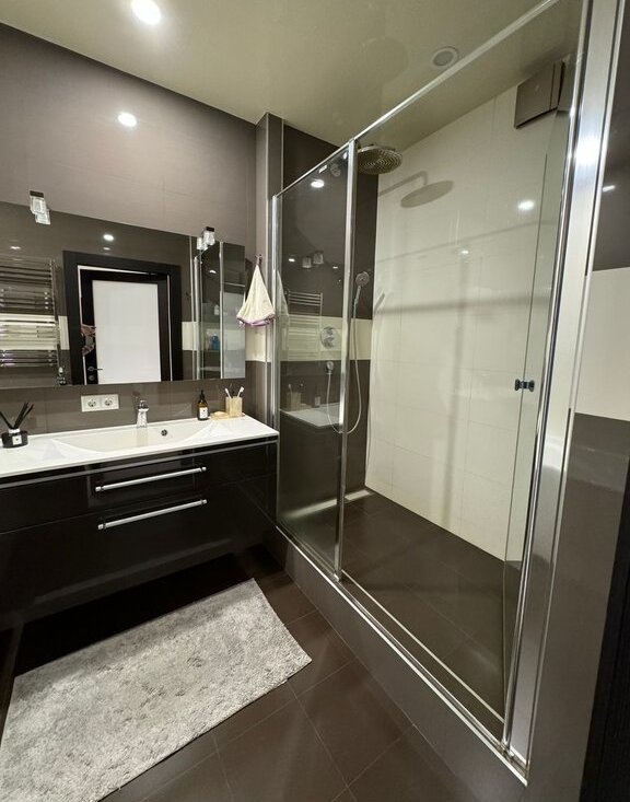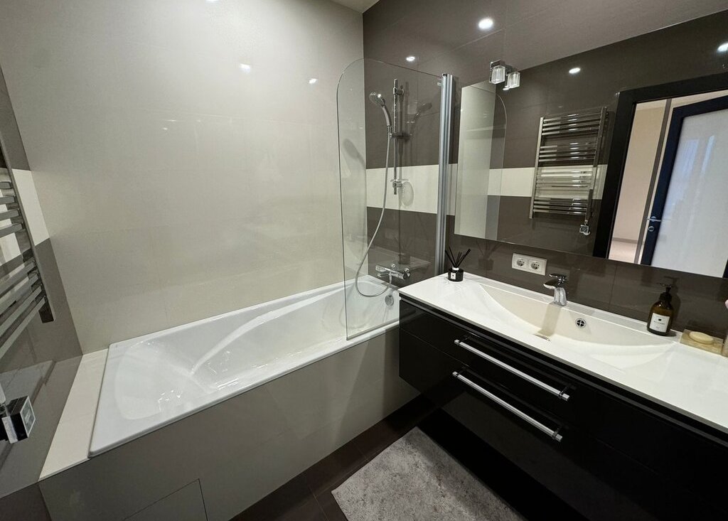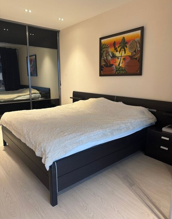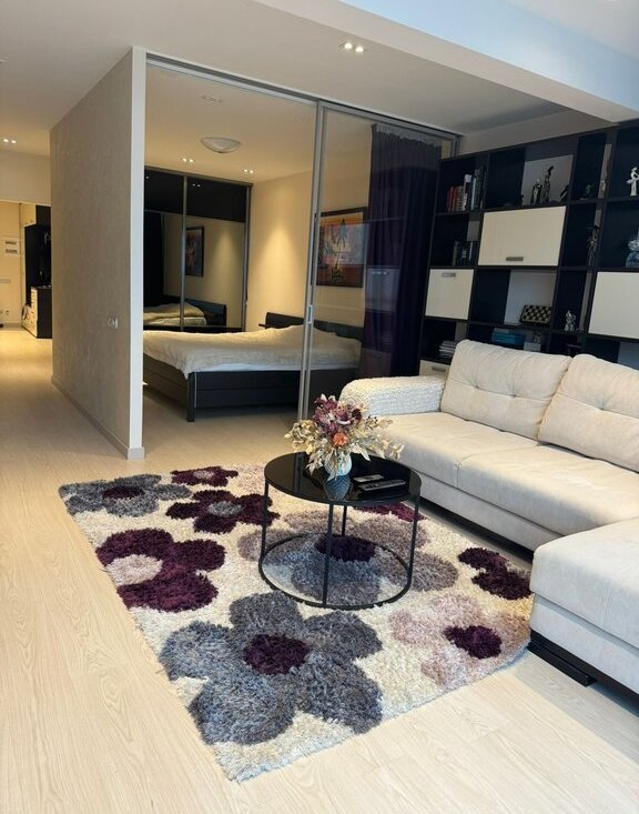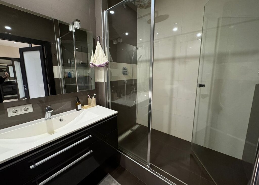 Внутри квартиры современный дизайн и все необходимые удобства. Спальня оформлена с учетом комфорта и уюта. В ванной комнате есть душевая с верхним душем и ванна. На кухне есть вся необходимая техника. Отдельно оборудован хоз. блок. Для вещей два огромных шкафа, в коридоре и в спальне.