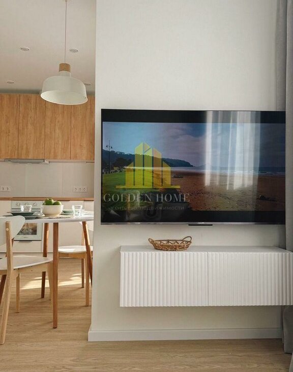 — В гостиной: угловой диван, QLED Smart-TV 55" (Android).