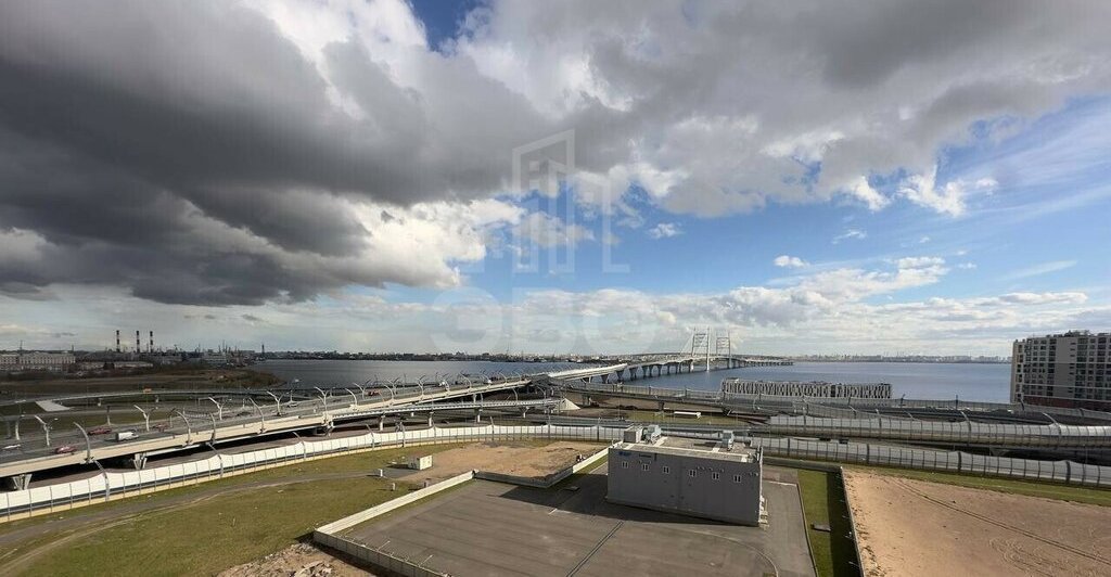 12 этаж, солнечная сторона, панорамный вид на залив и Вантовый мост. Из кухни — выход на просторную панорамную лоджию.