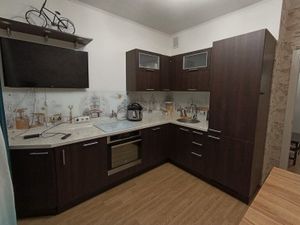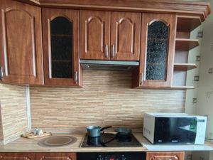 Просторная кухня‑гостиная с полным набором техники: индукционная панель, вытяжка, холодильник, чайник, вся необходимая посуда. Уютный большой диван, обеденный стол и телевизор создадут атмосферу домашнего тепла.