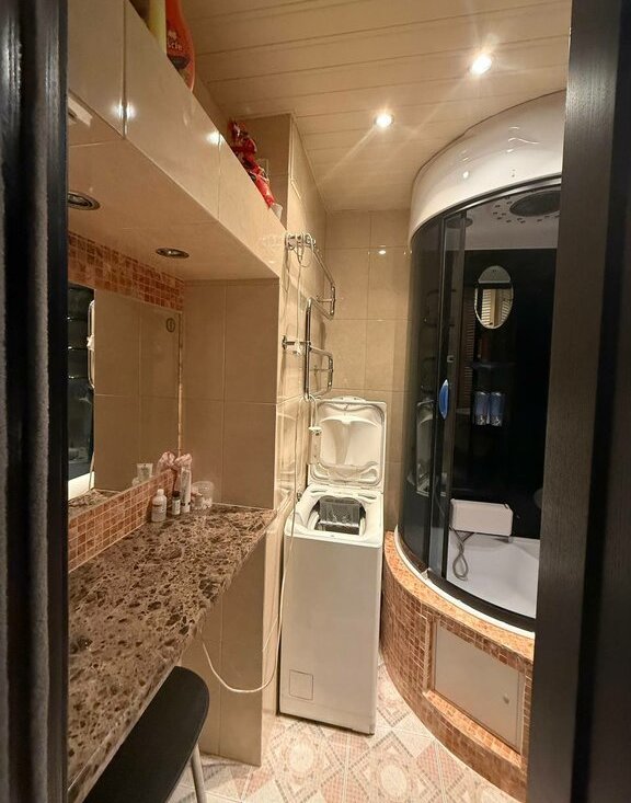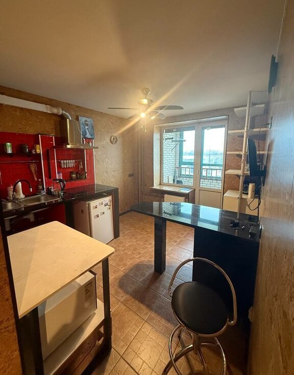 Комната 15 м2, кухня — 10 м2,застекленная лоджия, раздельный санузел, электроплита, стиральная машина, мебель и кондиционер. В доме 4 лифта.
