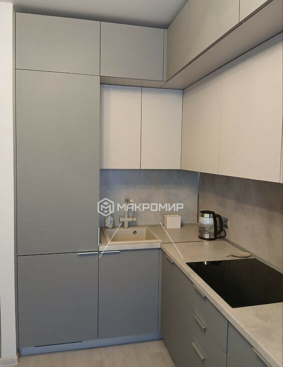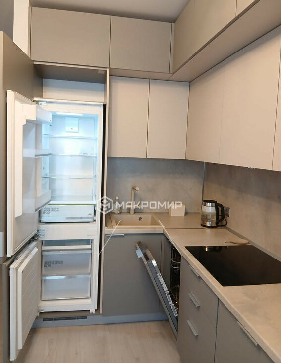 Большая кухня 10.6 кв.м. с современным гарнитуром, где всё продумано до мелочей: встроенный холодильник, посудомоечная машина, керамическая поверхность, духовой шкаф, СВЧ, вытяжка и дополнительная подсветка. Обеденный стол для вкусных дегустаций.