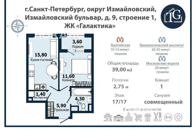 1-комнатная квартира: Санкт-Петербург, Измайловский бульвар, 9 (39 м²)
