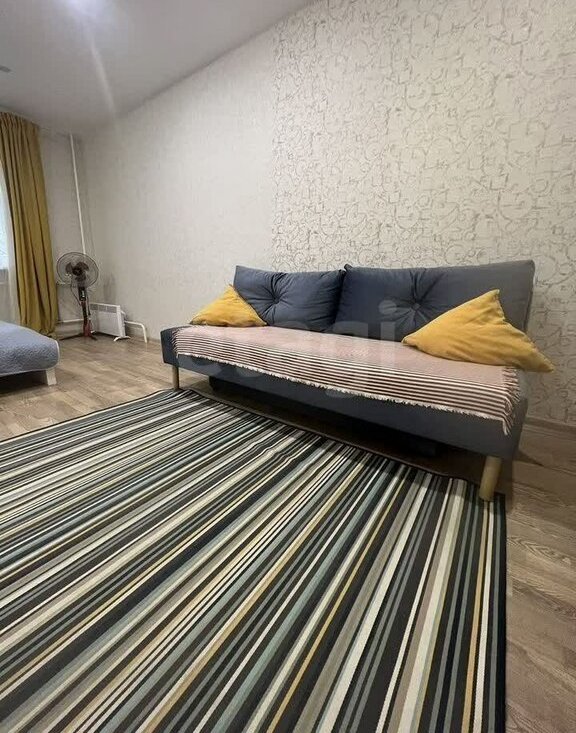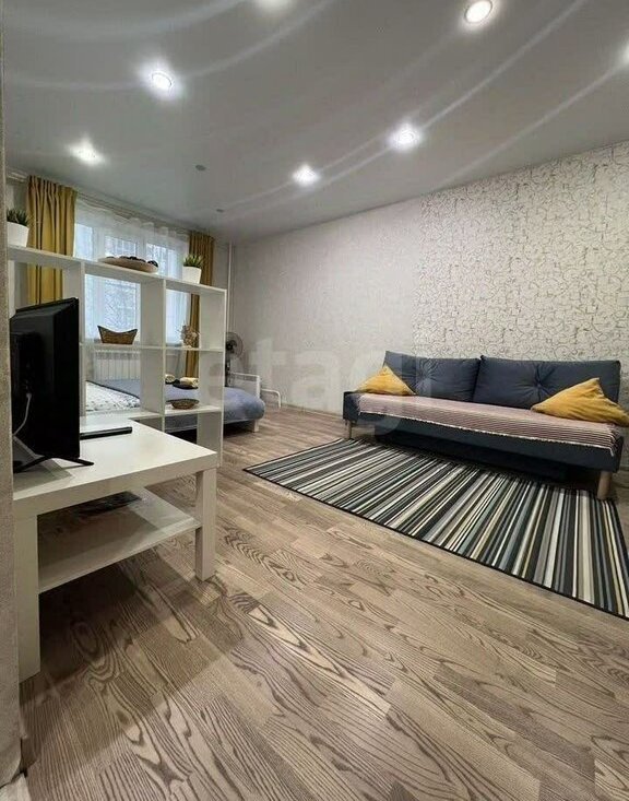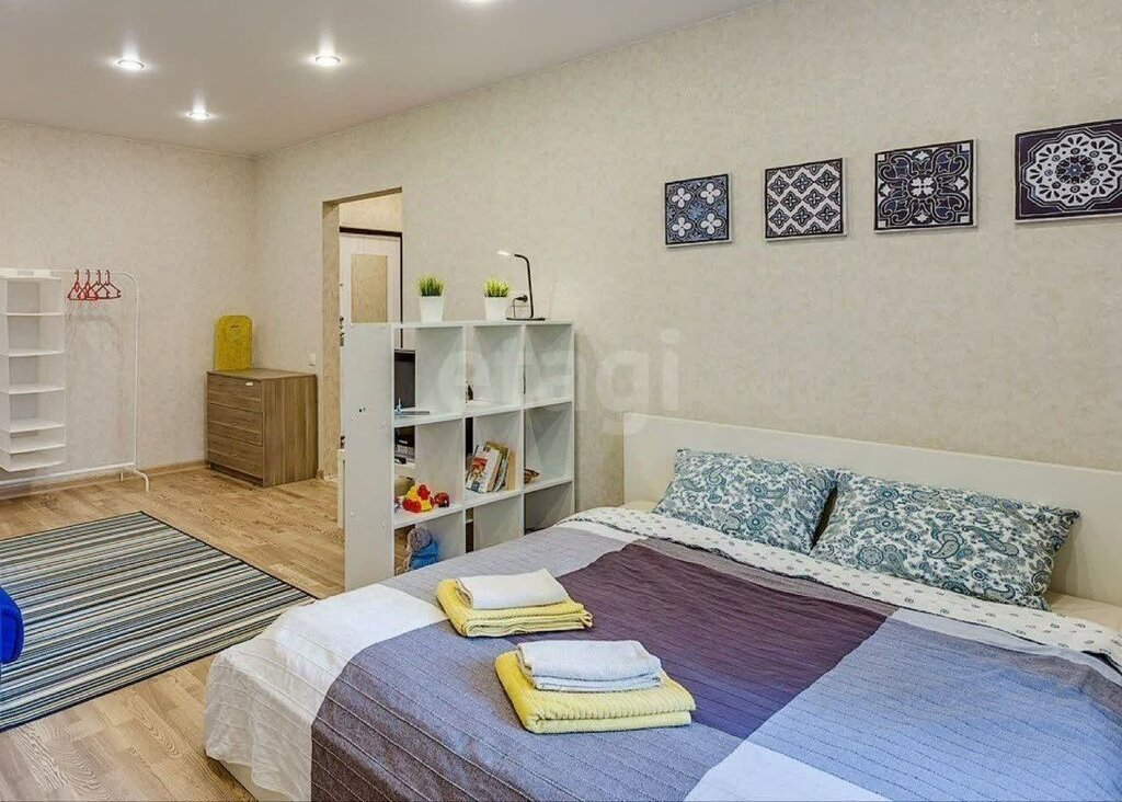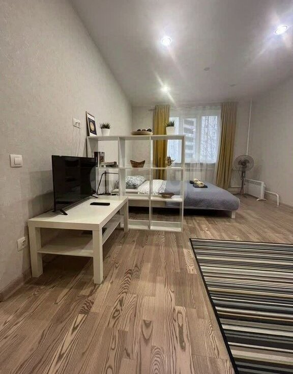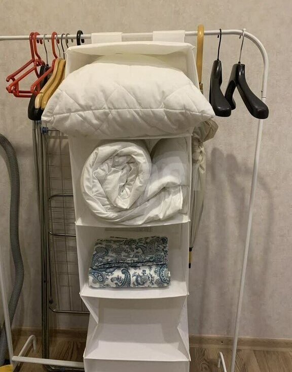 Слева от входа в квартиру-комната, разделенная на 2 зоны стеллажом. Кровать шириной 160 см, диван (тоже раскладывается). Также, в комнате есть комод и вешалка для одежды для хранения вещей.