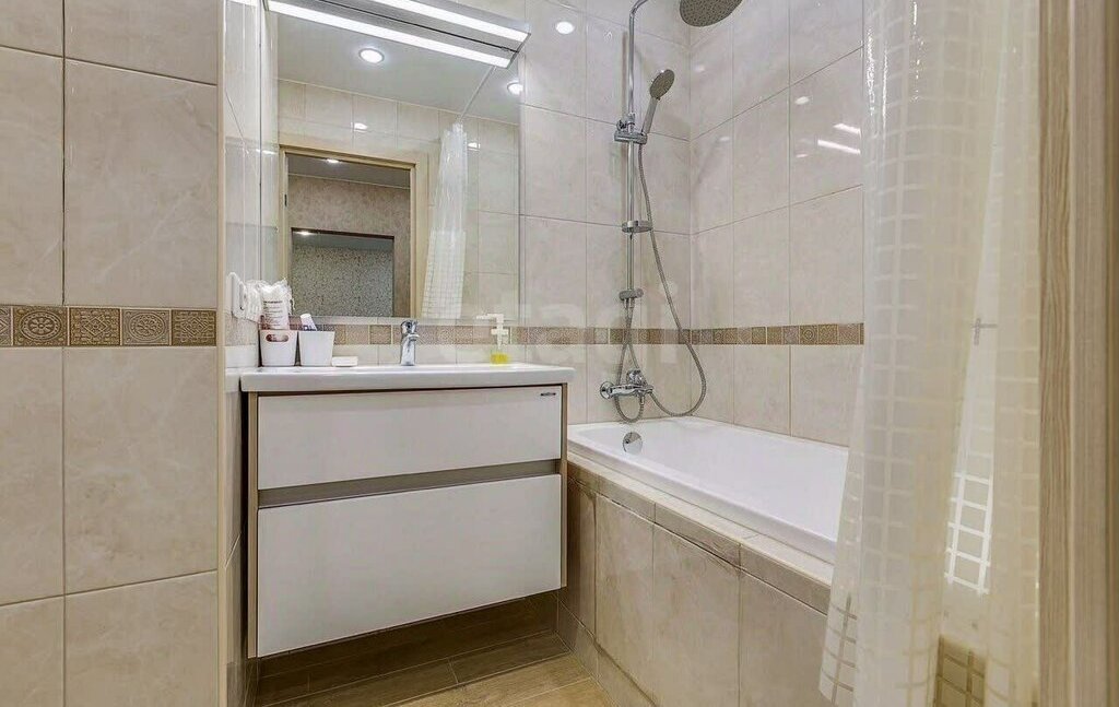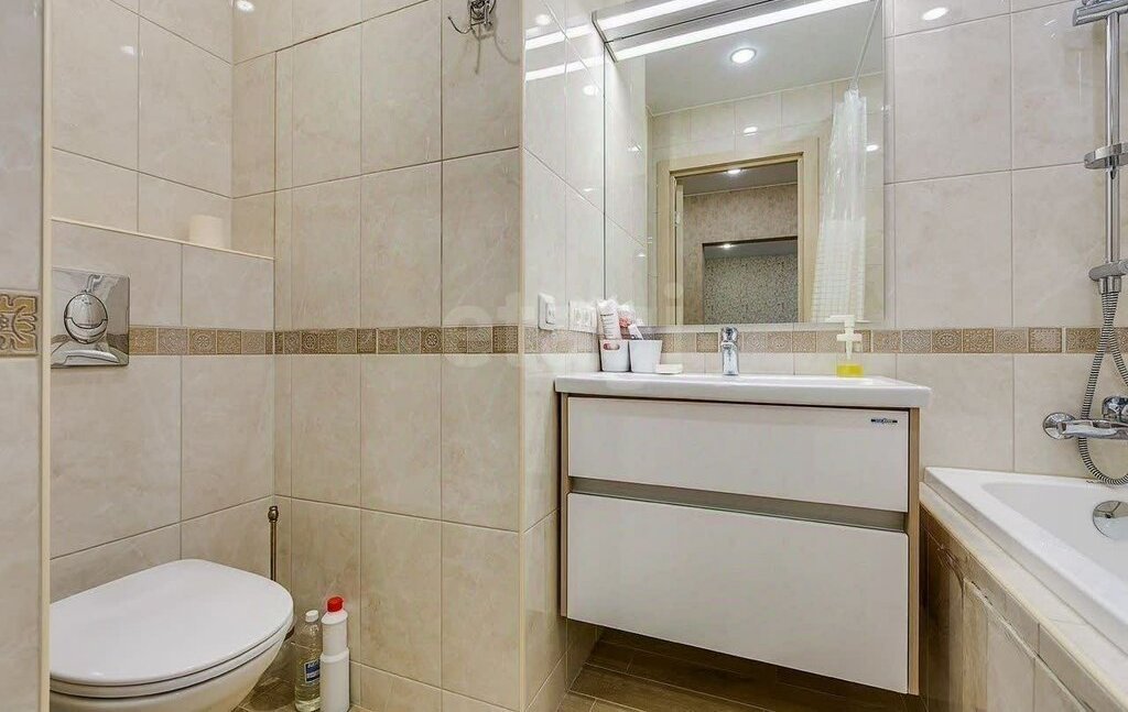 В коридоре есть комод для хранения вещей, вешалка для верхней одежды. Слева от входа-совмещенный санузел с ванной, широкой раковиной с местом для хранения, туалетом. Полы с подогревом.