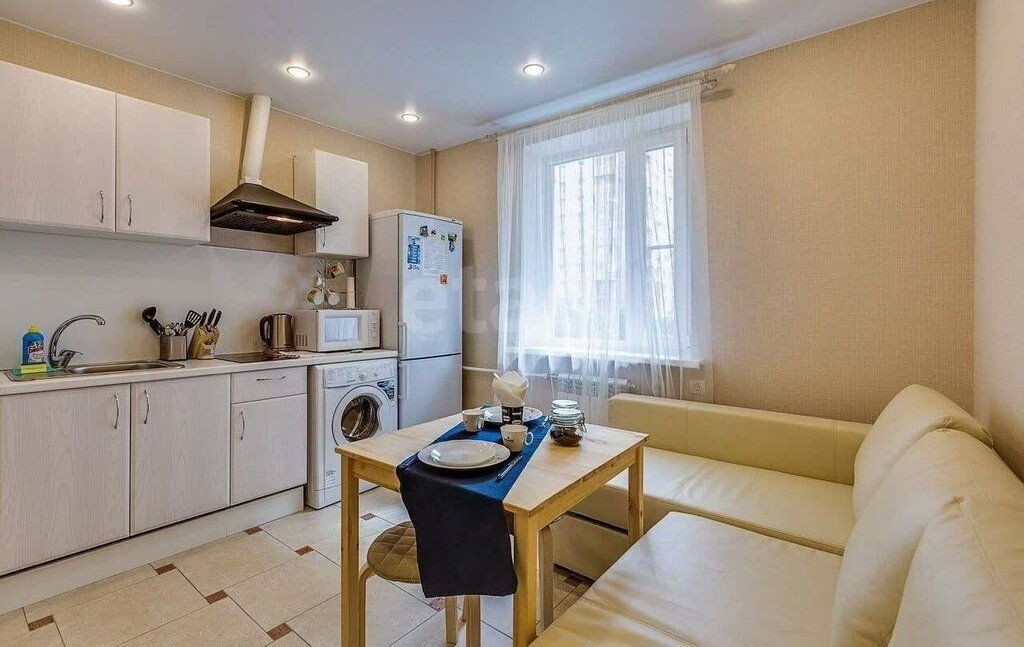 Далее, прямо расположена кухня с кухонным гарнитуром, встроенной плитой на 2 комфорки, стиральной машиной и холодильником. Духовки нет, но как бонус-есть кофемашина. Также, установлен фильтр с питьевой водой. Диван раскладывается, поэтому можно использовать его как спальное место.