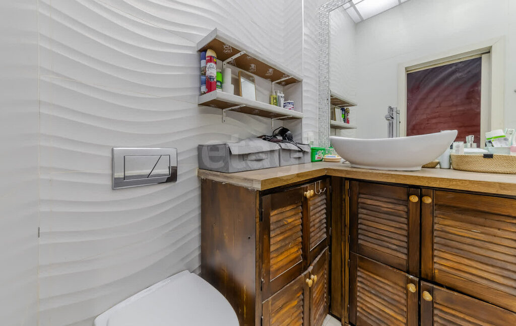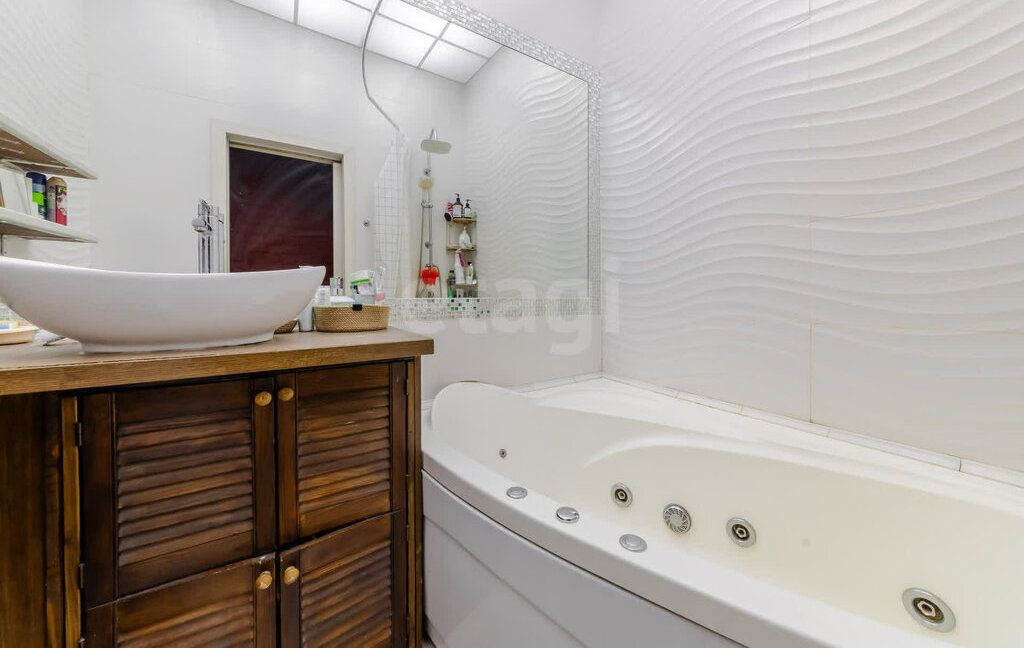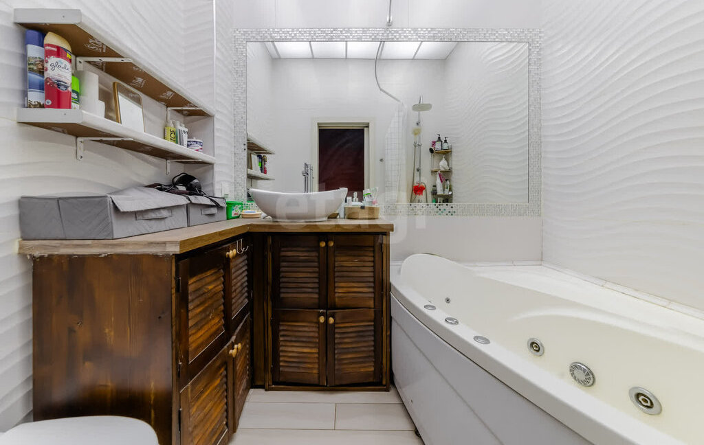 Совмещенный санузел с полупанорамным зеркалом,ваннной и тропическим душем.