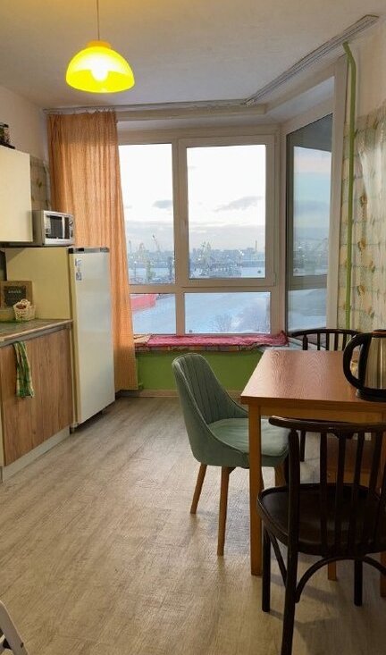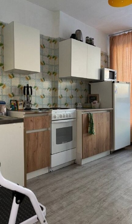 Из мебели и техники всё есть. Кухня просторная, с большими окнами, оснащена необходимой техникой: холодильник, плита, микроволновая печь.