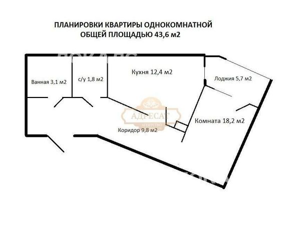 Квартира однокомнатная, общей площадью 43,6 м2, из них комната – 18,2 м2, кухня 12,4 м2. Санузел раздельный. Просторная, светлая лоджия 5,7 м2 с видом из окна во двор.