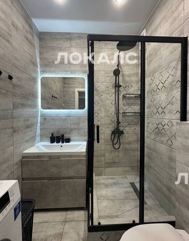 стиральная машина, современная душевая, зеркало с подсветкой.