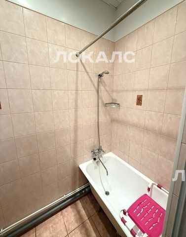 * Ванная комната с ванной и душем, кафельные стены, сантехника в хорошем состоянии.