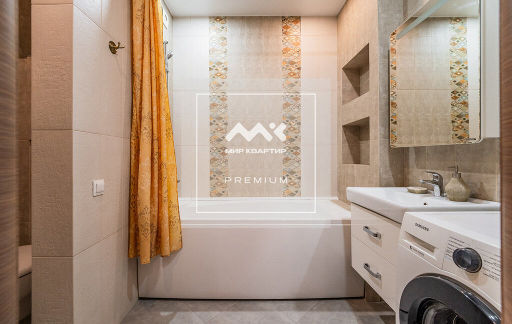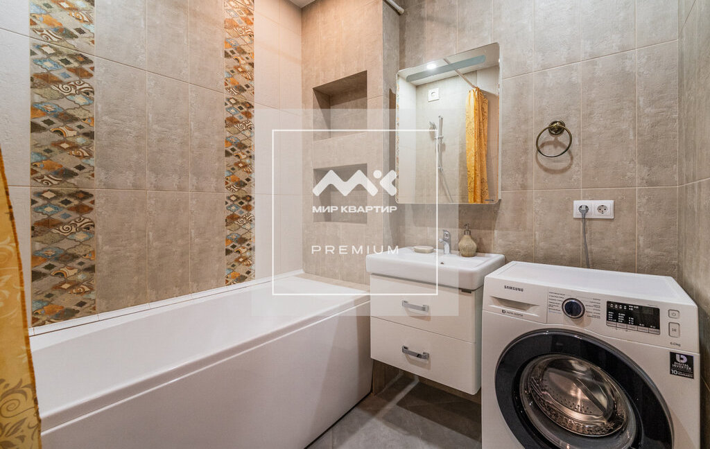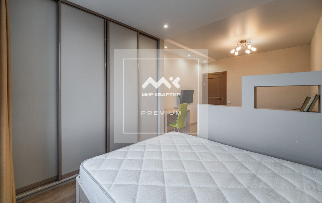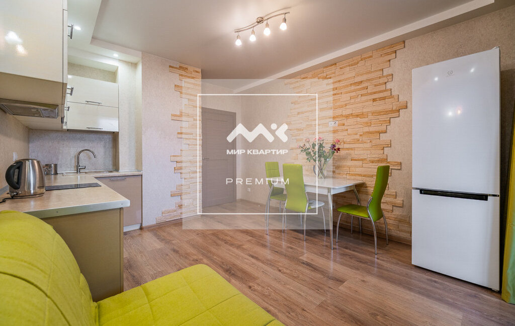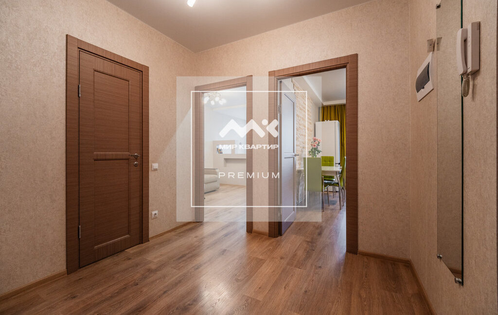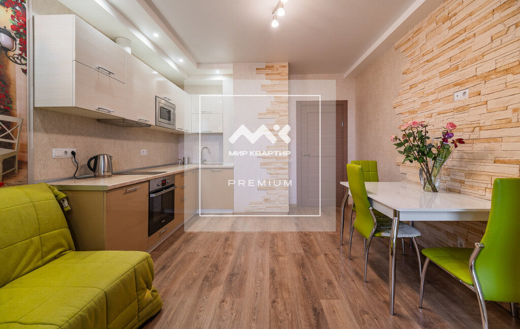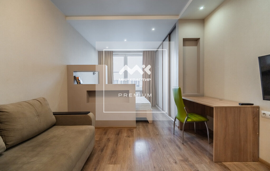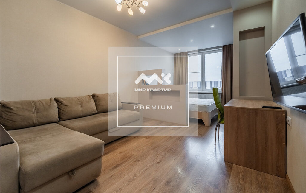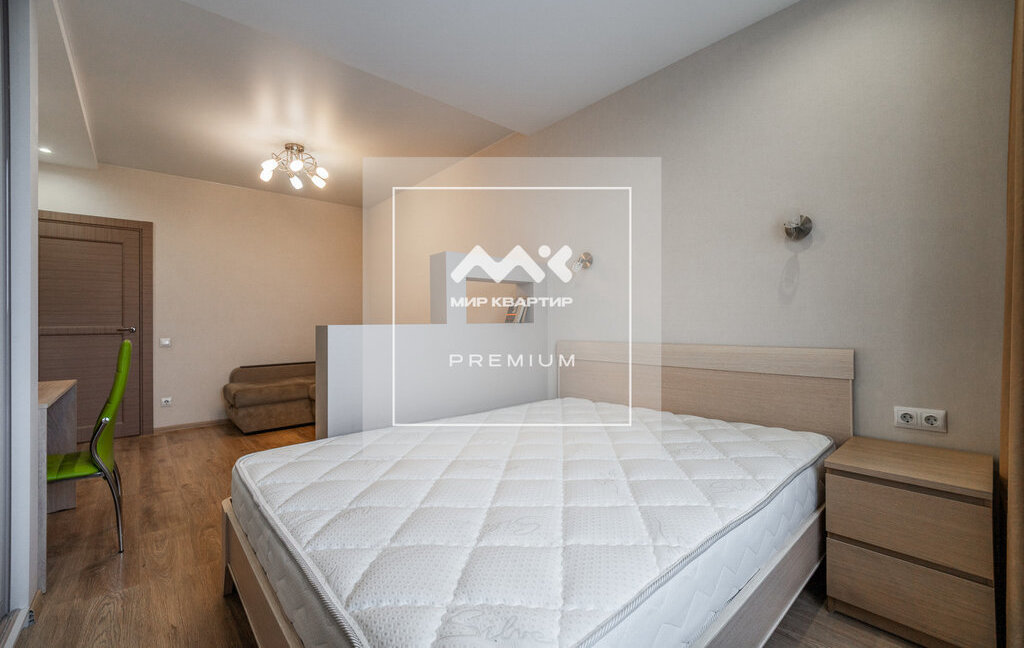 Квартира расположена на 8 этаже. Общая площадь 46 кв.м, на которой разместилась большая комната с разделённым пространством спальни и зоны отдыха. Просторная кухня, оборудованная всей необходимой техникой, а так же есть вместительные системы хранения.