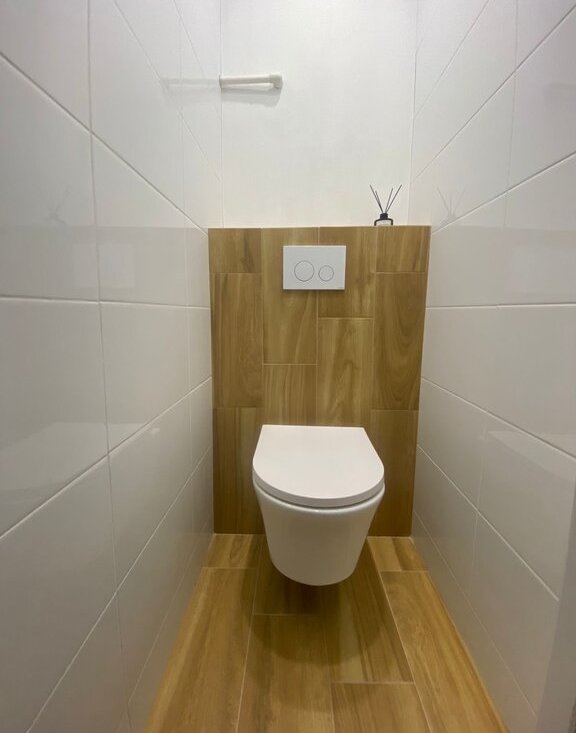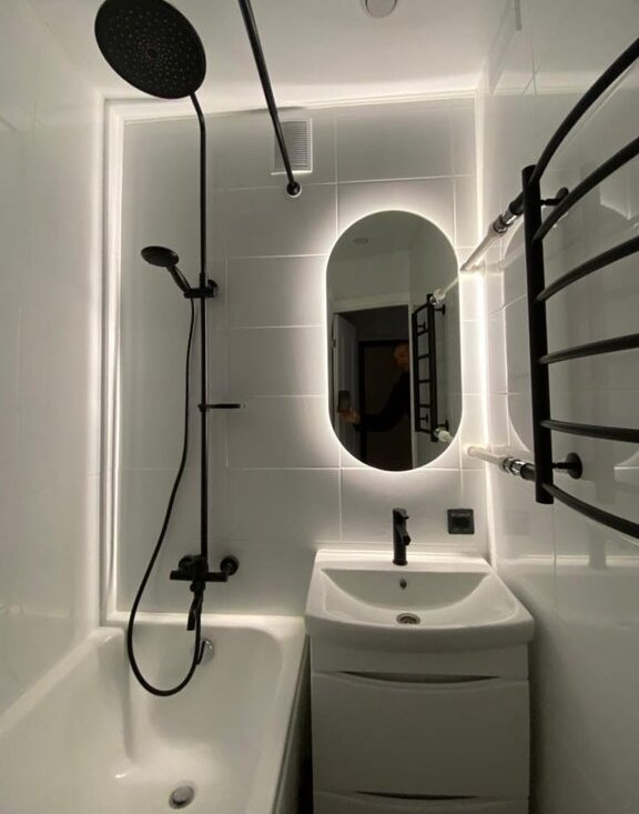 Новая сантехника - ванна, инсталляция. Установлен смеситель в ванной с тропическим душем.