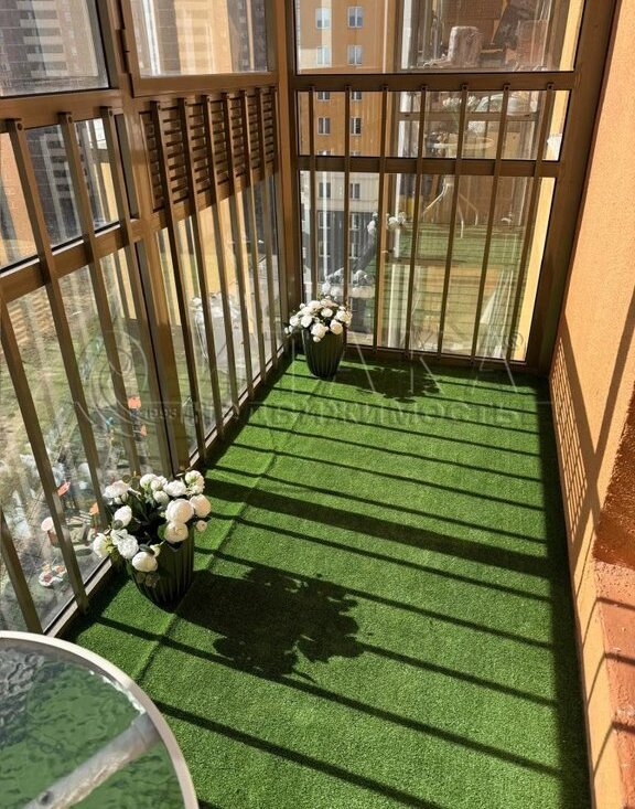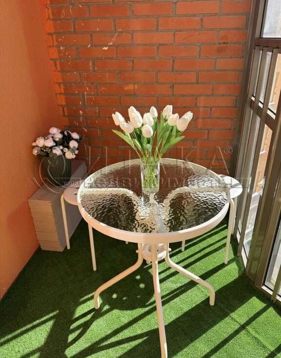 Застеклённая лоджия с оборудованной зоной отдыха. Есть домофон, вайфай.