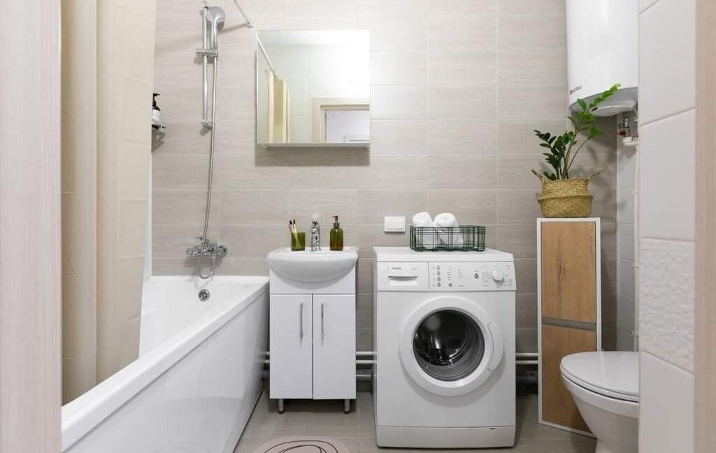 Также есть кухня с полным набором посуды, холодильник, микроволновая печь, TV, фен, утюг, гладильная доска, сушилка для белья, пылесос, чайник и санузел с полноценной ванной. Предоставляются 2 уборки в месяц с заменой белья и полотенец на чистое.