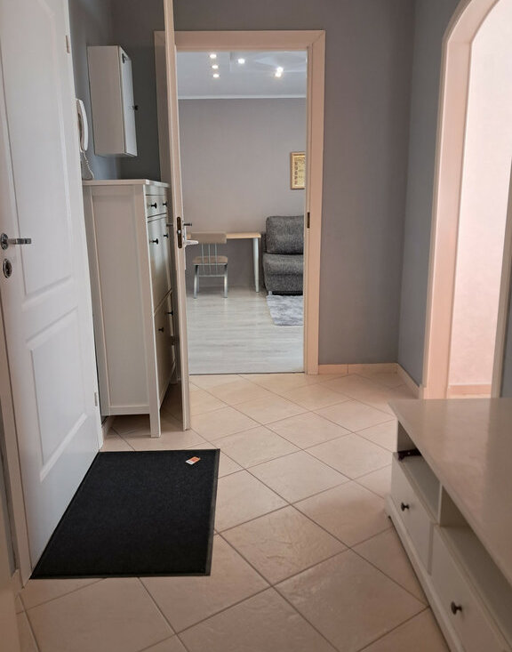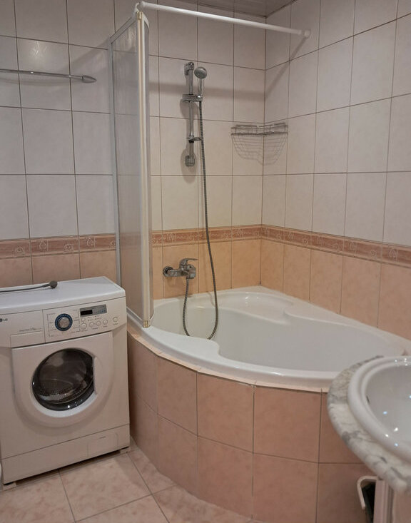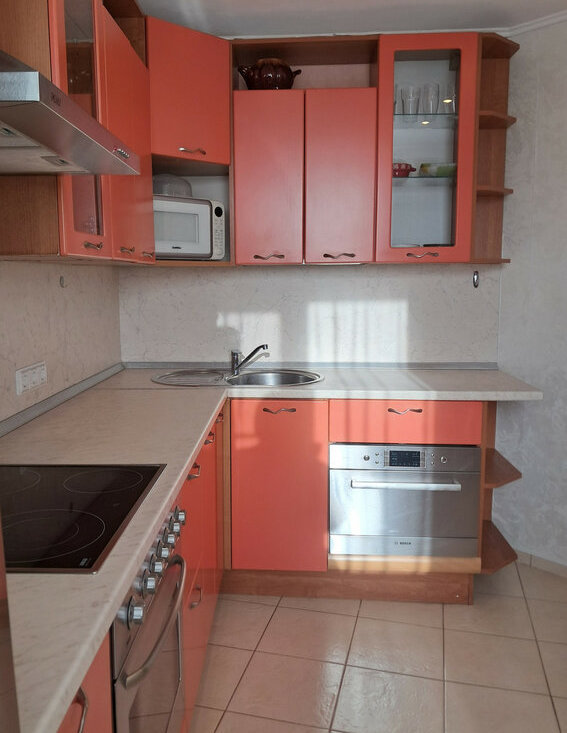 Квартира укомплектована всем необходимым для длительного проживания: 2 спальных места (раскладывающийся диван), полностью кухонная мебель и техника (микроволновая печь, холодильник, посудомоечная машина, плита с духовым шкафом, маленький телевизор).