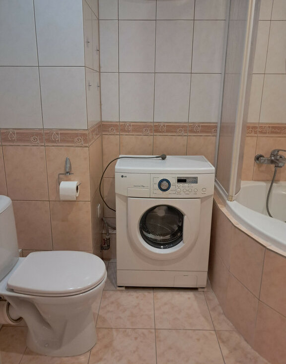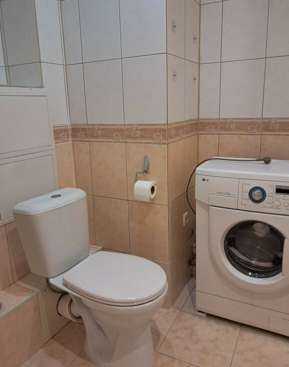 Квартира укомплектована всем необходимым для длительного проживания: 2 спальных места (раскладывающийся диван), полностью кухонная мебель и техника (микроволновая печь, холодильник, посудомоечная машина, плита с духовым шкафом, маленький телевизор).