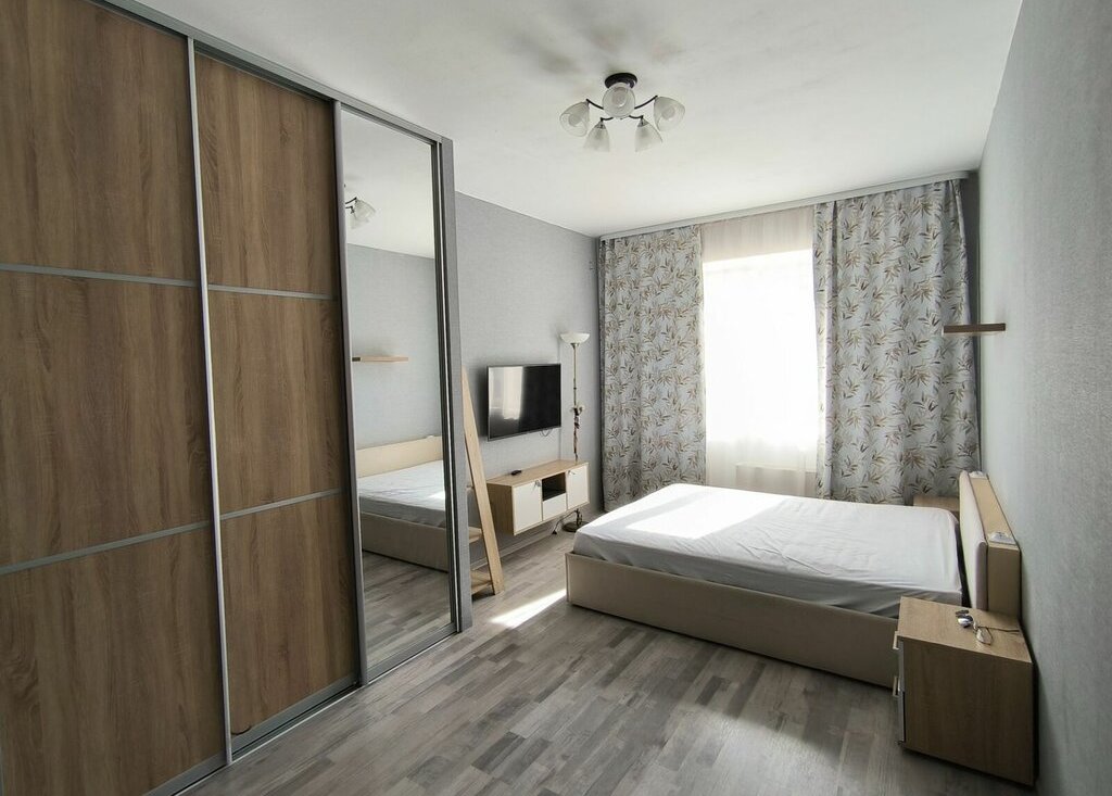 Светлая просторная комната со спальным местом. Современный ремонт, мебель и освещение. Прихожая оборудована двумя встроенными шкафами для хранения одежды и хозяйственных принадлежностей.