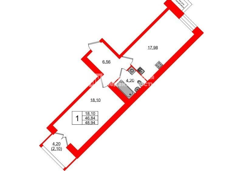 1-комнатная квартира: Санкт-Петербург, Лиственная улица, 20к2 (46.8 м²)