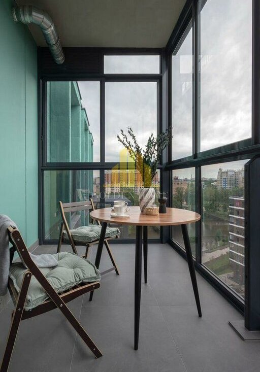 Из гостиной можно выйти на просторный балкон с панорамными окнами, откуда открывается боковой вид на реку. В спальне расположен французский балкон.