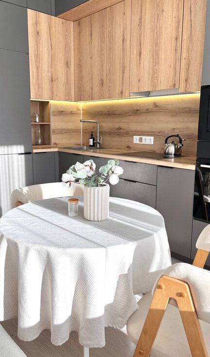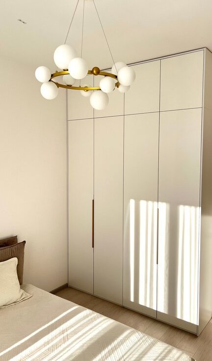 Много мест хранения: кухня с большими вместительными модулями под потолок. Также большой четырехдверный шкаф в комнате.