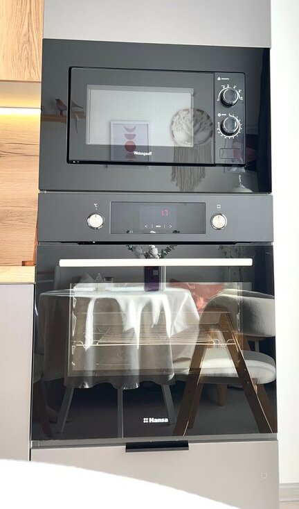 Вся техника для комфортной жизни: духовой шкаф с конвекцией, микроволновка, вытяжка, электрическая варочная поверхность, посудомоечная машинка, стиральная машина, пылесос. В ванной теплый пол.