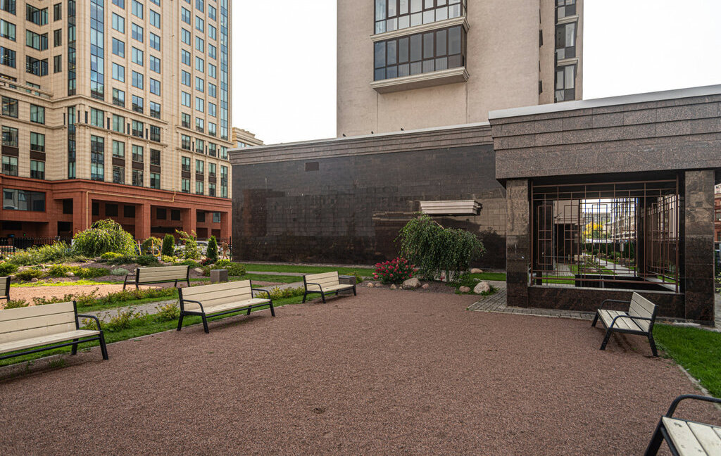 Закрытая территория комплекса, большой зеленый двор, круглосуточная охрана, консьерж, видеонаблюдение. Подземный паркинг, спуск с лифта. Небольшое количество проживающих.