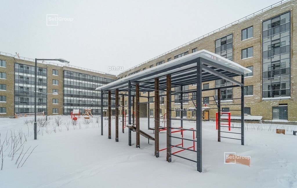 Приличная закрытая территория, сразу сдается с инфраструктурой (детский сад, школа, площадки, турники). Кустарники и деревья сажают с газонами.