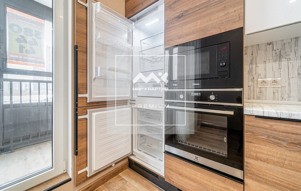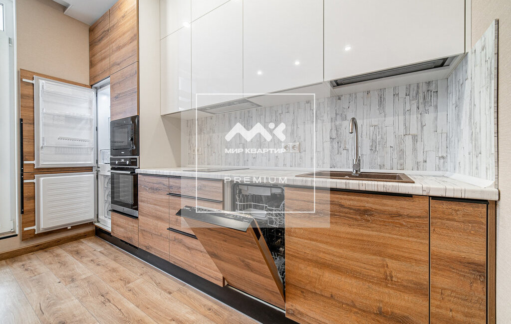 в стильный кухонный гарнитур встроены холодильник, микроволновая печь и духовой шкаф, посудомоечная машина, варочная поверхность с защитой от детей, вытяжка.
