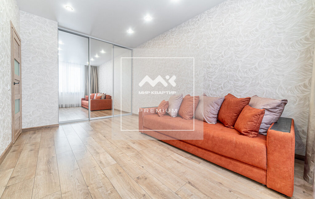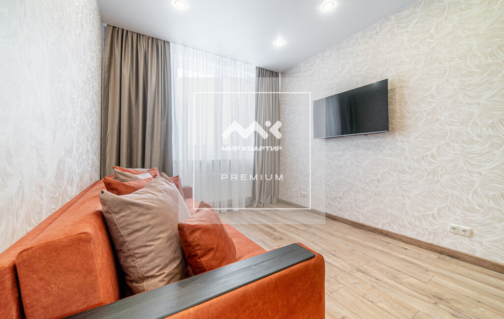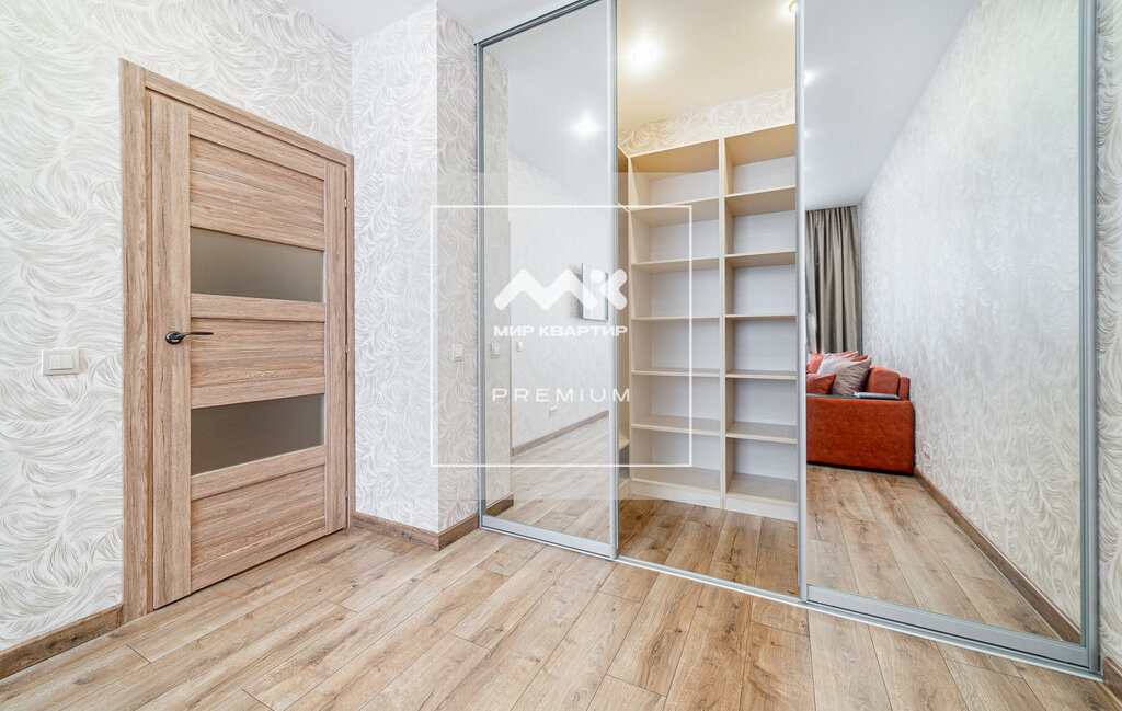 В комнате гардеробная во всю стену с зеркальными дверями-купе, полками и двумя отсеками для вешалок, удобный раскладывающийся диван. В квартире два телевизора.