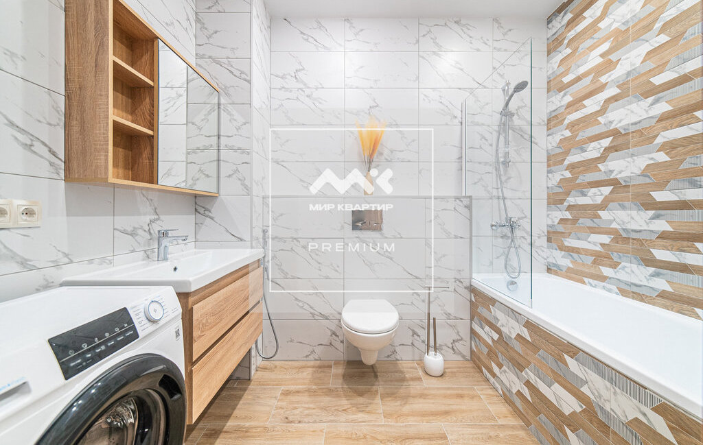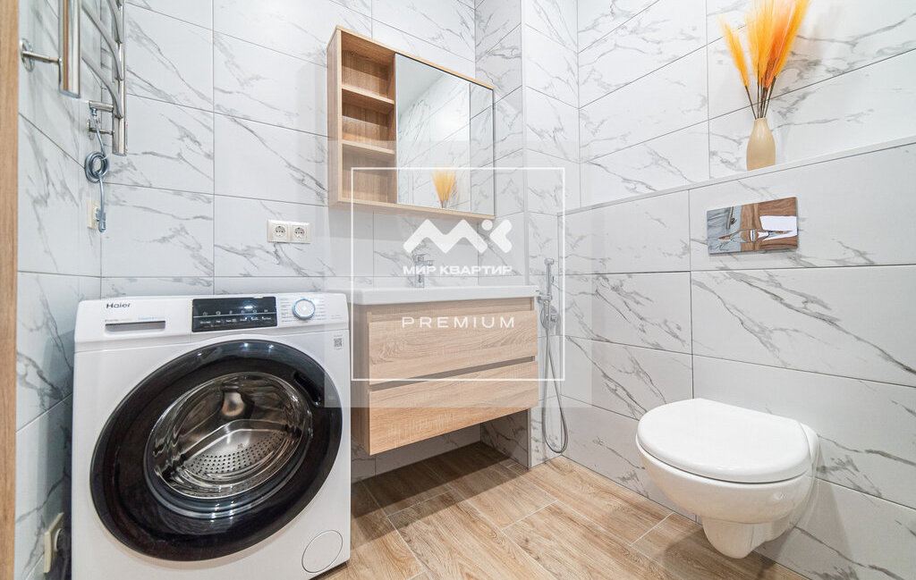 В просторной и светлой ванной комнате есть полотенцесушитель, гигиенический душ, большая ванна, стиральная машина и места для хранения.