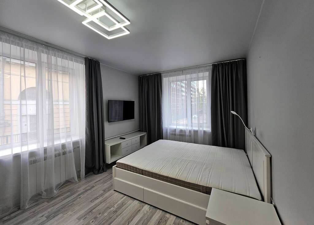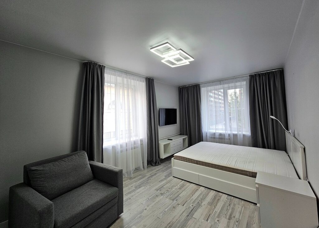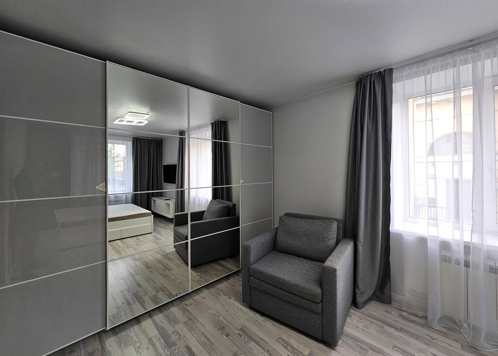 Комната очень светлая-2 окна. Имеется очень вместительный шкаф, двухспальная кровать, кресло-кровать, прикроватная тумба, ЖК телевизор Smart tv.