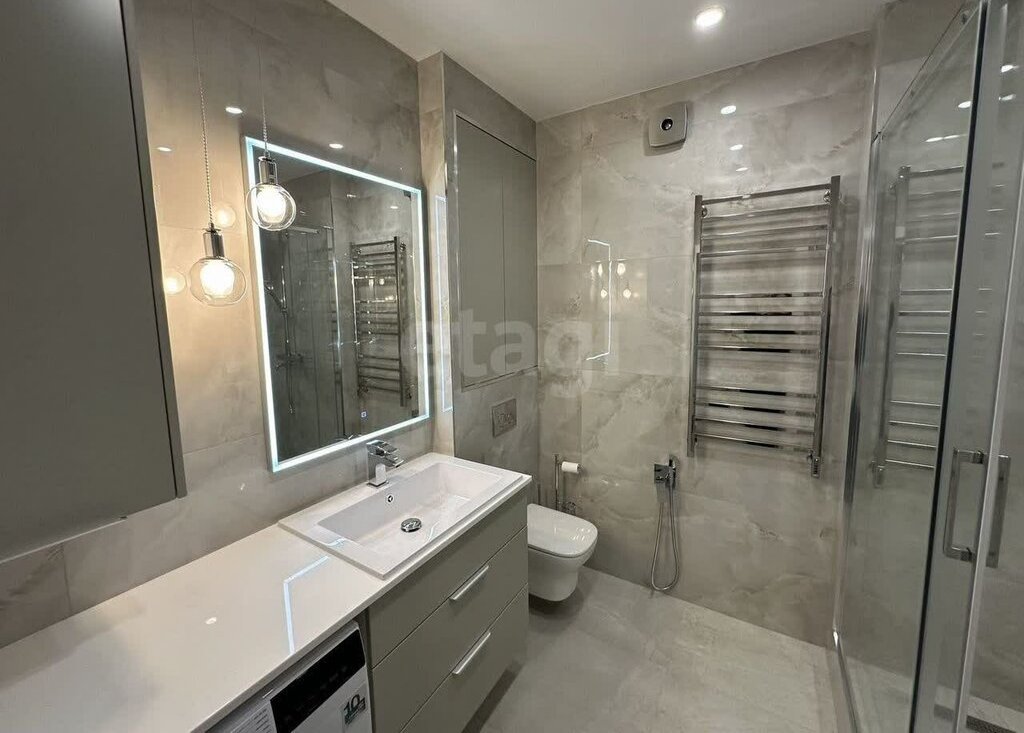 Совмещенный санузел выполнен в итальянском керамограните.