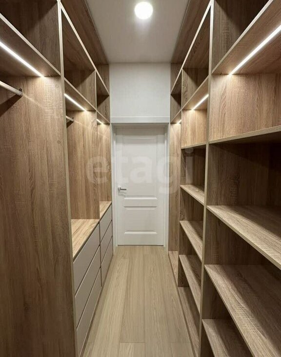 2. Гардеробная в спальне — просторная, с ящиками, продуманной системой хранения и подсветкой.