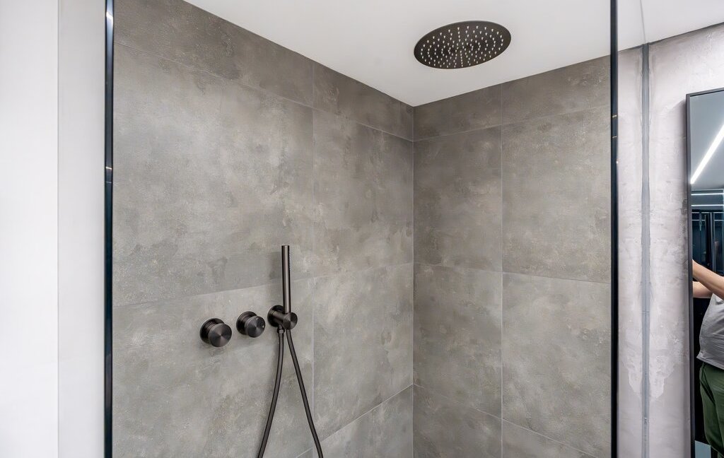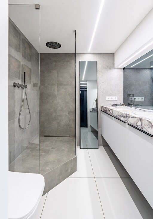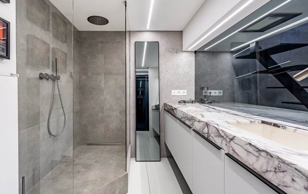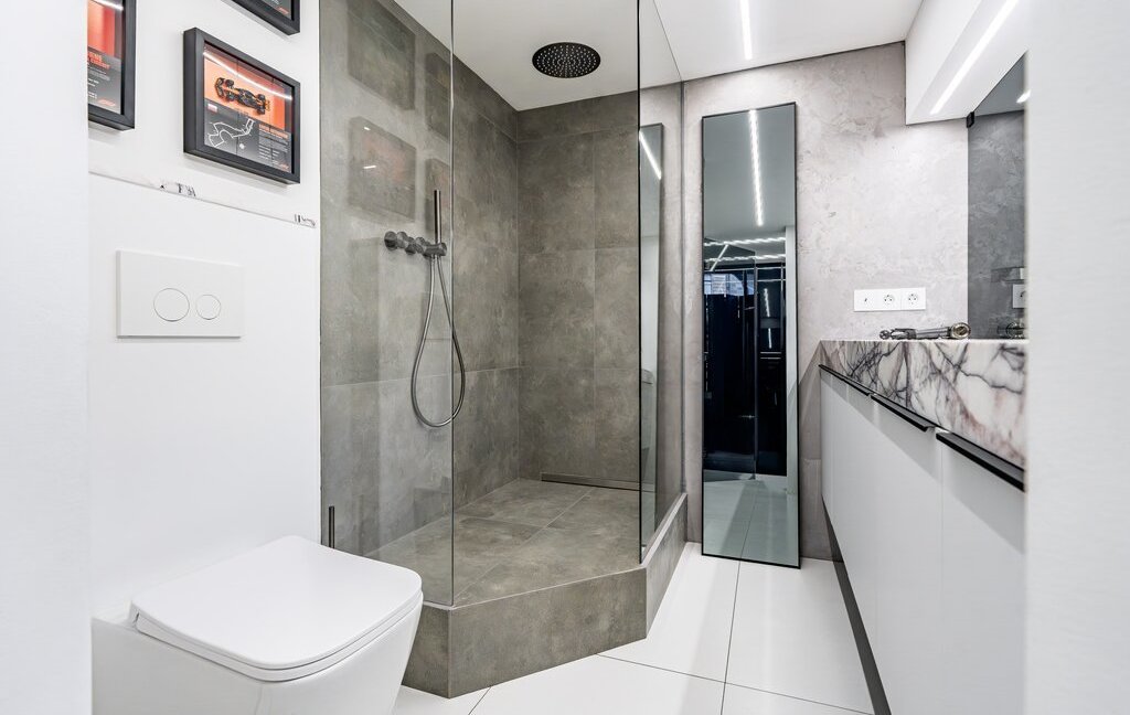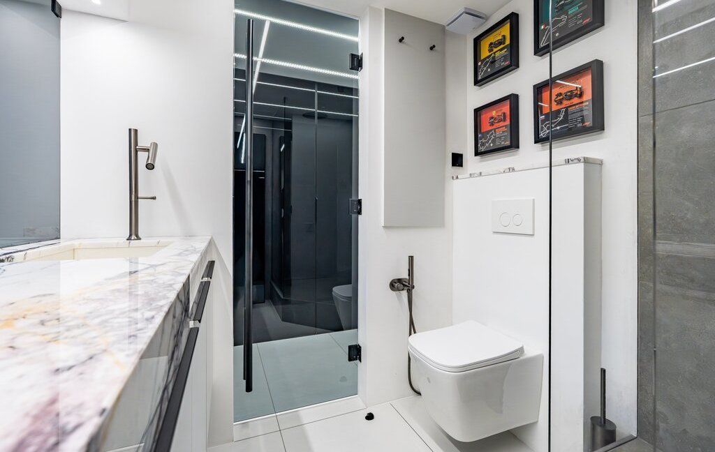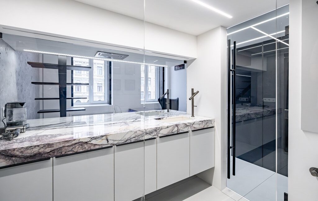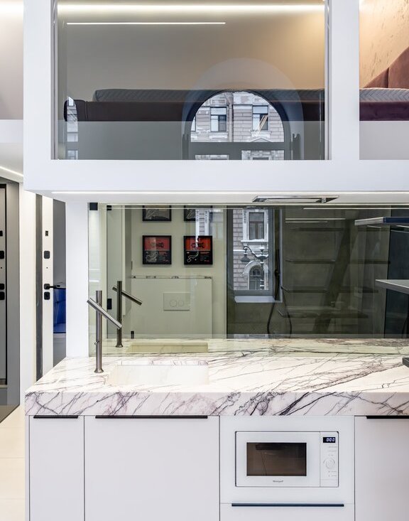 Просторный санузел, установлена современная бытовая техника. Кухонная зона оснащена мраморной столешницей, что добавляет ей элегантности.