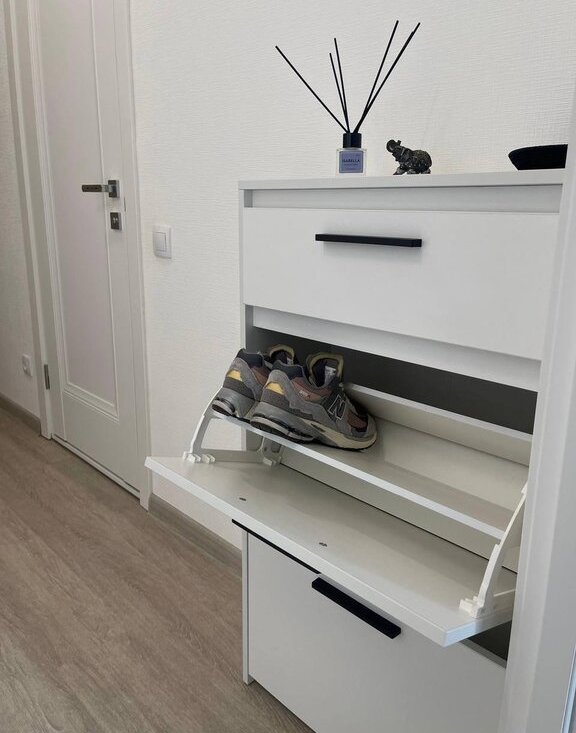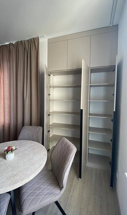Кухонный стол 90 сантиметров со вставкой — «бабочка», расположенная в центре, увеличивает длину поверхности до 125 сантиметров. Так же расположен большой и вместительный шкаф. Диван премиального качества от «Орматек», который оснащен невероятно удобным и долговечным механизмом «еврокнижка». За счет продуманной конструкции вы можете разложить половину или весь диван сразу.