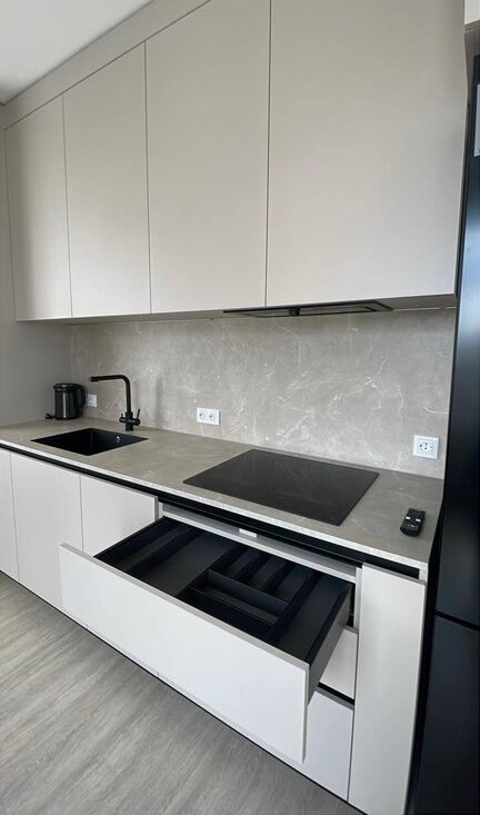 (Независимая индукционная варочная поверхность на 4 конфорки, встроенная вытяжка, встроенная посудомоечная машина 600 мм, встроенная микроволновая печь, электрический духовой шкаф, холодильник). Установлен водоочиститель Барьер, смеситель с двумя изливами для водопроводной и фильтрованной/питьевой воды.