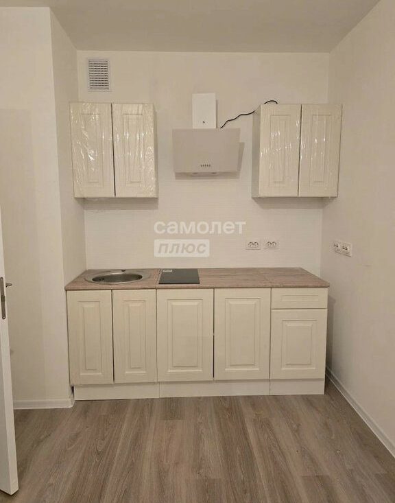 Квартира частично меблирована. Кухонный гарнитур с варочной панелью, шкаф и диван.